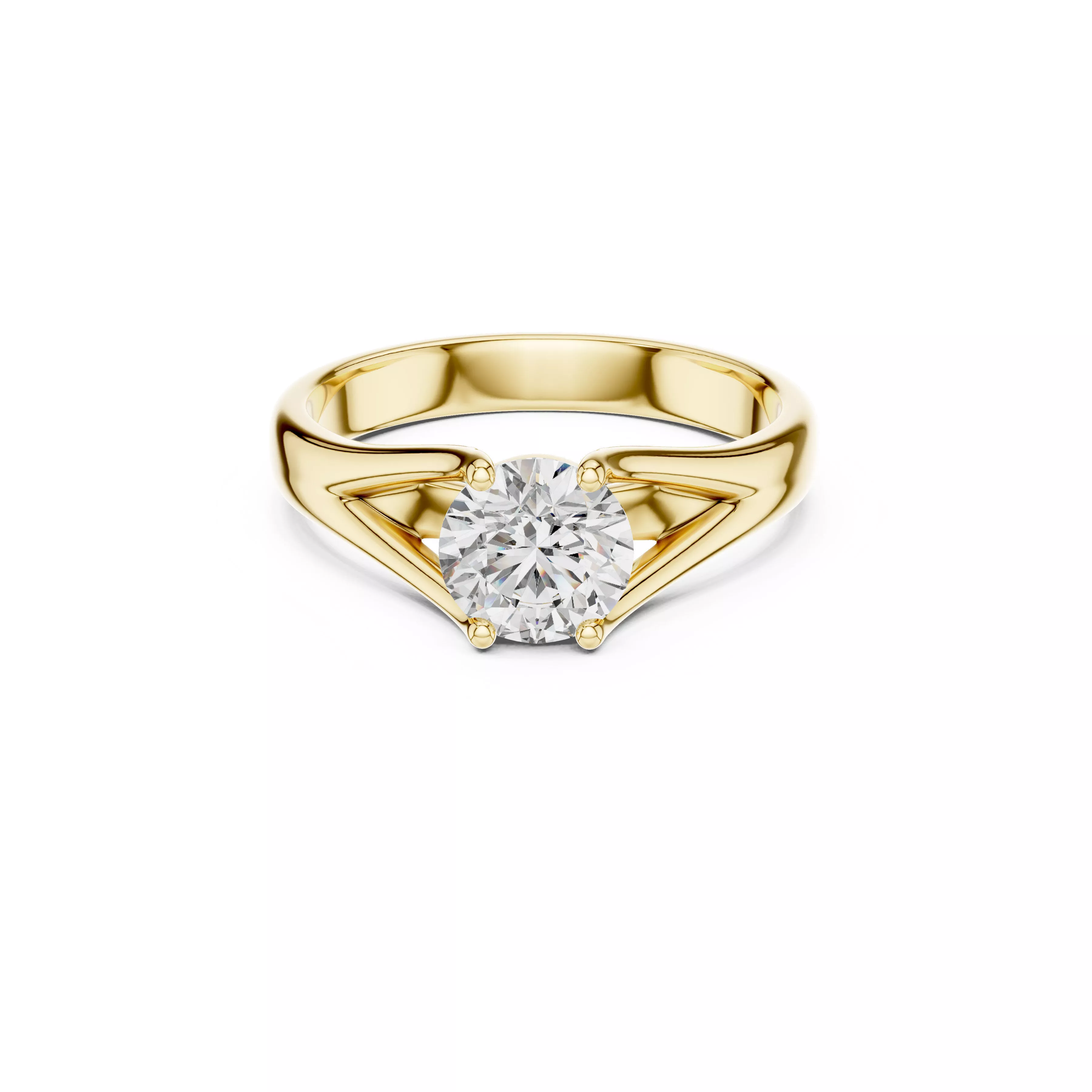 The band flows into sharp yet elegant angular supports beneath the center stone, forming a triangular framework that enhances light exposure and gives the ring a distinctive, contemporary edge. The clean high-polish finish complements the structured design, making it both eye-catching and refined.