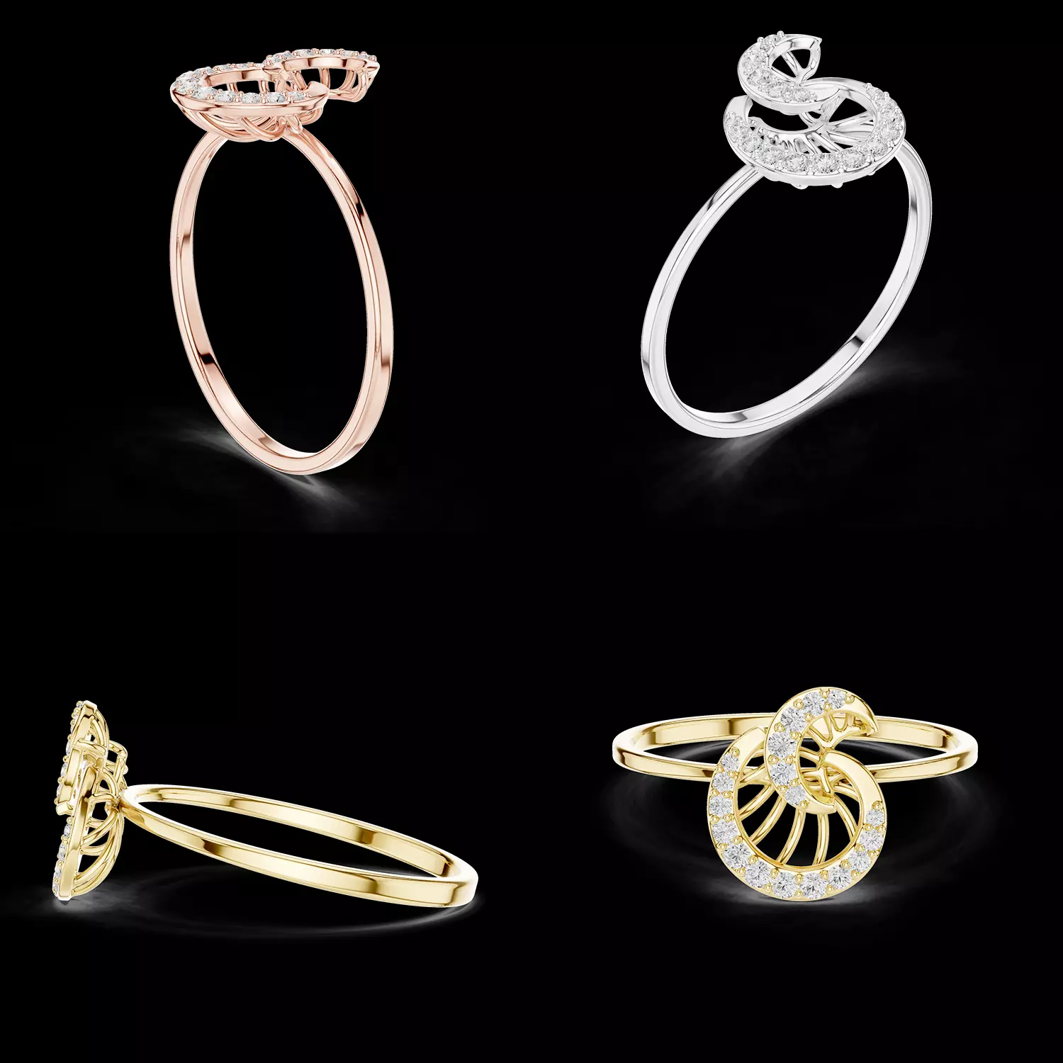This elegant spiral ring design features a flowing circular structure that blends modern geometry with delicate diamond brilliance. The ring showcases a graceful spiral motif formed by interlocking circular elements, creating a dynamic and artistic appearance.