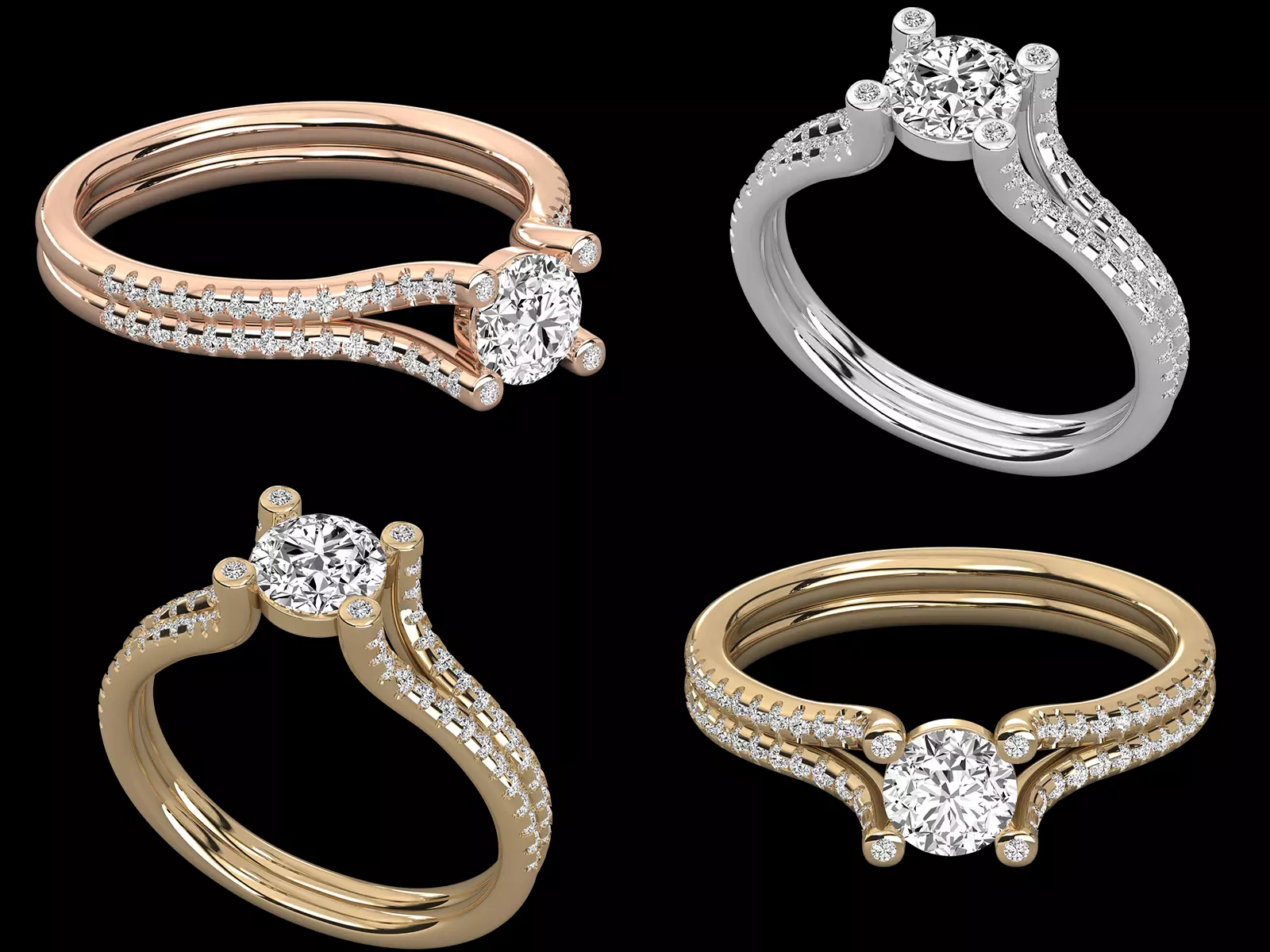 Ring Type: Solitaire diamond ringDesign Style: Modern split band pavé designSetting Type: Prong set center stone with accent detailsBand Style: Double row split pavé shankModel Quality: Production-ready CAD model