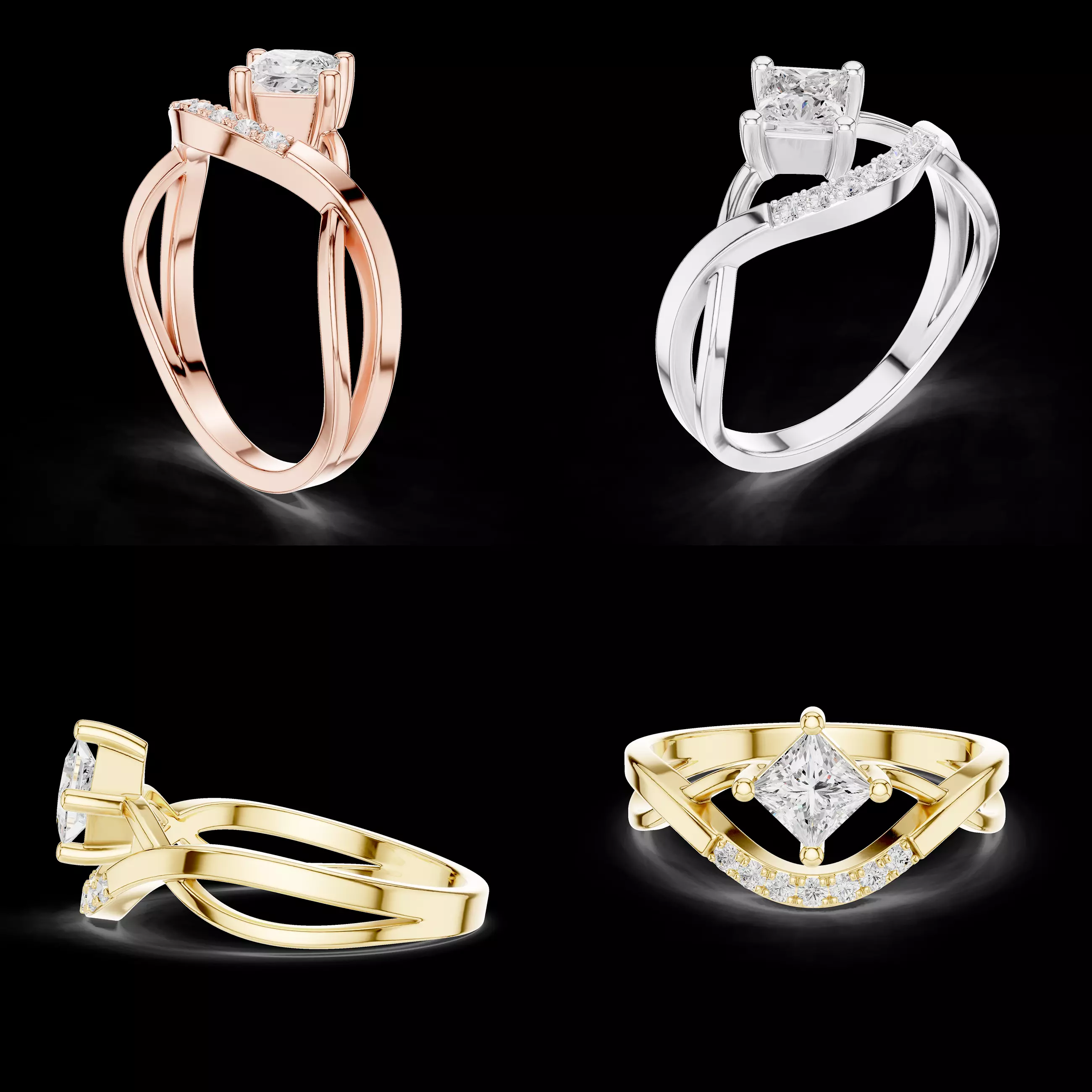 • Production-ready jewellery CAD model• Optimized geometry for casting and finishing workflows• Suitable for gold, platinum, and silver production• Secure princess-cut stone prong setting• Modern split-shank band structure• Pavé diamond accent detailing• Easy resizing and customization possible• Ideal for engagement and bridal jewellery collections