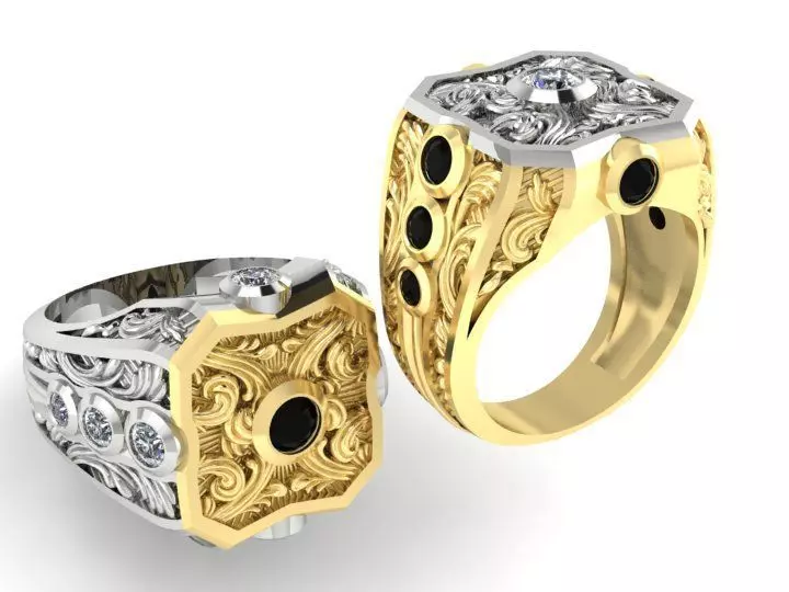 signet mens ring with gems . american size 13.25, 12 , 11.25, 10.5, 9.5(diameter 22.3 , 21.2 , 20.7, 20 ,19.1mm) . 14k gold weigth 19.3 gr. silver weigth 15.4 gr. Volume = 1893.36904 (+/- 1e-06) cubic millimeters for 2 solids. gems 5mm-1pc. 4mm-4 pc. 3.5mm-2pc. 3mm-2pc.You can see the dimensions of the model on one of the photos presented here.Contains render gems files.Mesh: vertex count = 158213 facet count = 23406090% of my 3d models have been checked: made wax and finished product in gold or silver . High polygonal model.Made in program Matrix+Rhinoceros+Zbrush . The 3DM file contains only the mesh and gems.Model was checked and healed in program Magics .Ready for the print.