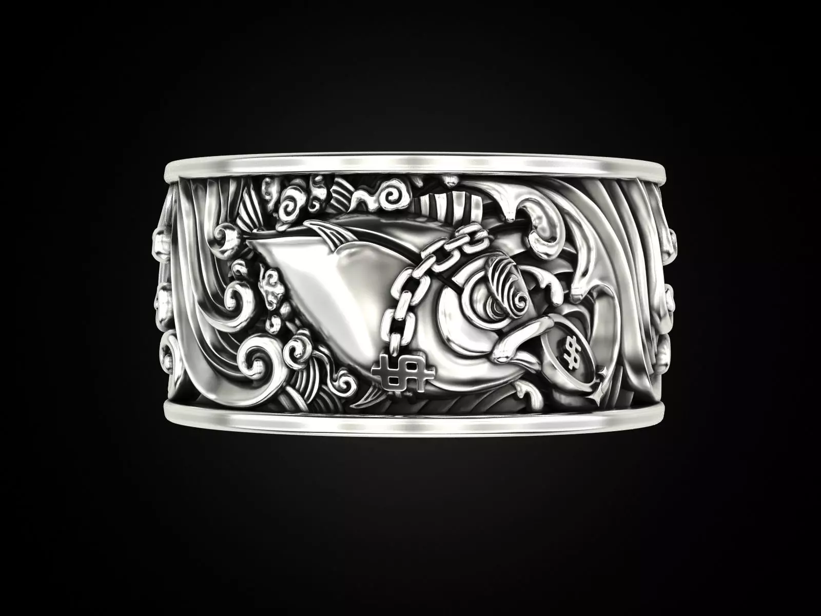 This stunning design captures the wild power of the sea, with fierce waves crashing as a giant tuna leaps above the surface, grasping coins in its jaws—a symbol of prosperity and abundance. The intricate detailing of the fish, chain, and swirling waters creates a dynamic sense of motion and depth. Crafted with a bold aesthetic, this ring is a striking representation of fortune, adventure, and the untamed energy of the ocean. Perfect for those seeking a unique and meaningful statement piece.