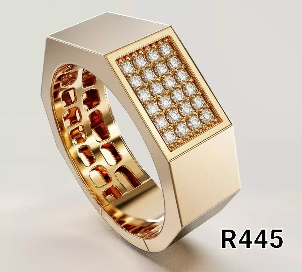 This gold ring is defined by a strong architectural silhouette combined with a precisely structured stone-set surface.The flat geometric top creates a bold, confident presence, while the grid arrangement of stones adds depth, texture, and controlled brilliance.Clean edges and solid volumes enhance durability and ensure excellent performance during casting and polishing processes.The open internal design reduces overall weight and improves comfort without compromising strength or visual impact.This model has been carefully engineered for accurate stone setting, smooth finishing, and efficient mass production.The design is fully tested, technically clean, and ready for professional jewelry manufacturing.Thank you for choosing a model developed with a focus on precision, quality, and contemporary luxury aesthetics.