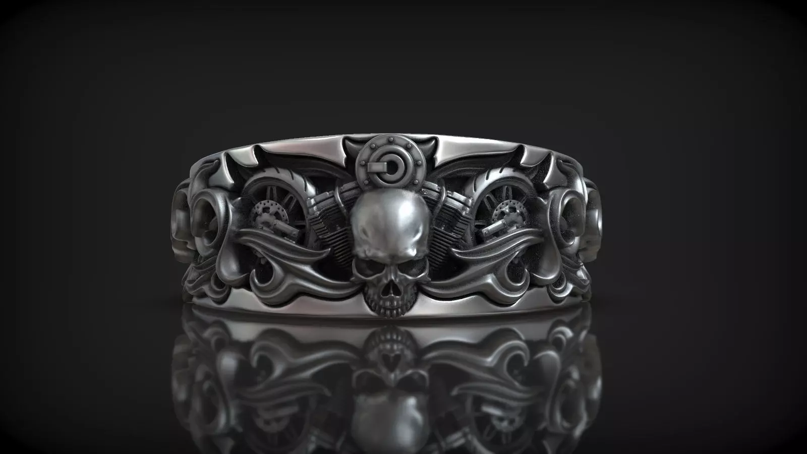It's a bold 3D ring model that embodies the spirit of the open road and the freedom of the biker lifestyle. At its center lies a detailed skull and a motorcycle engine, symbolizing the adventurous spirit of bikers.The central skull, intricately crafted, exudes an air of rebellion and independence, while the motorcycle engine adds a touch of raw power and mechanical prowess. Together, they encapsulate the essence of the biker ethos, evoking images of speed, adrenaline, and the open highway.Adorning the ring are intricately designed motorcycle wheels on either side, representing the iconic symbol of two-wheeled freedom. Additionally, flame motifs reminiscent of fiery tongues dance along the edges, adding a dynamic and edgy touch to the design.Crafted with meticulous attention to detail using advanced 3D modeling techniques, this ring captures the rugged charm and ruggedness of the biker aesthetic.Wearing this ring is a bold declaration of individuality and rebellion, a symbol of the untamed spirit that drives bikers to seek adventure on the open road. It serves as a constant reminder of the thrill of the ride and the camaraderie of the biker brotherhood.