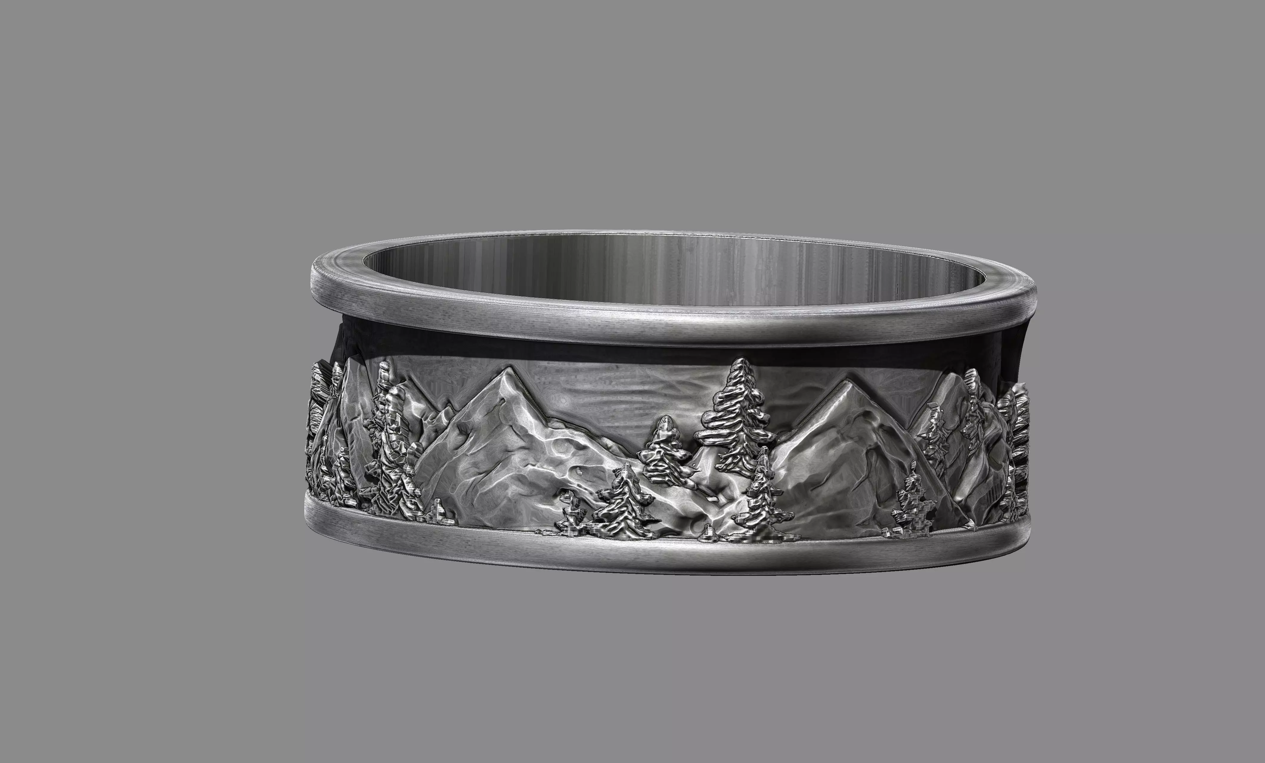 A serene, nature-inspired wedding band featuring a continuous mountain and forest landscape engraved around the ring. The balanced design blends rugged peaks with flowing tree lines, symbolising stability, growth, and a shared journey through nature. Designed for high-quality 3D printing and suitable for metal casting, this ring is ideal for wedding bands, promise rings, or meaningful outdoor-inspired jewellery pieces.