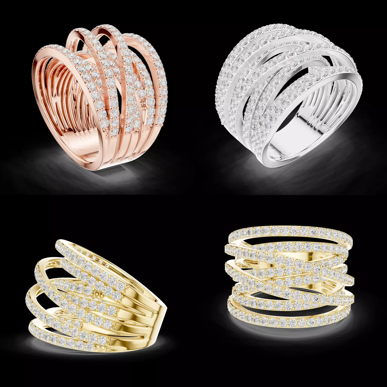 This multi row diamond pave crossover ring is designed as a bold statement piece with a luxurious layered structure. The design features multiple flowing bands that overlap in an elegant crisscross formation, creating depth, movement, and strong visual impact. Each row is adorned with round brilliant diamonds in pave setting, delivering continuous sparkle from every angle.