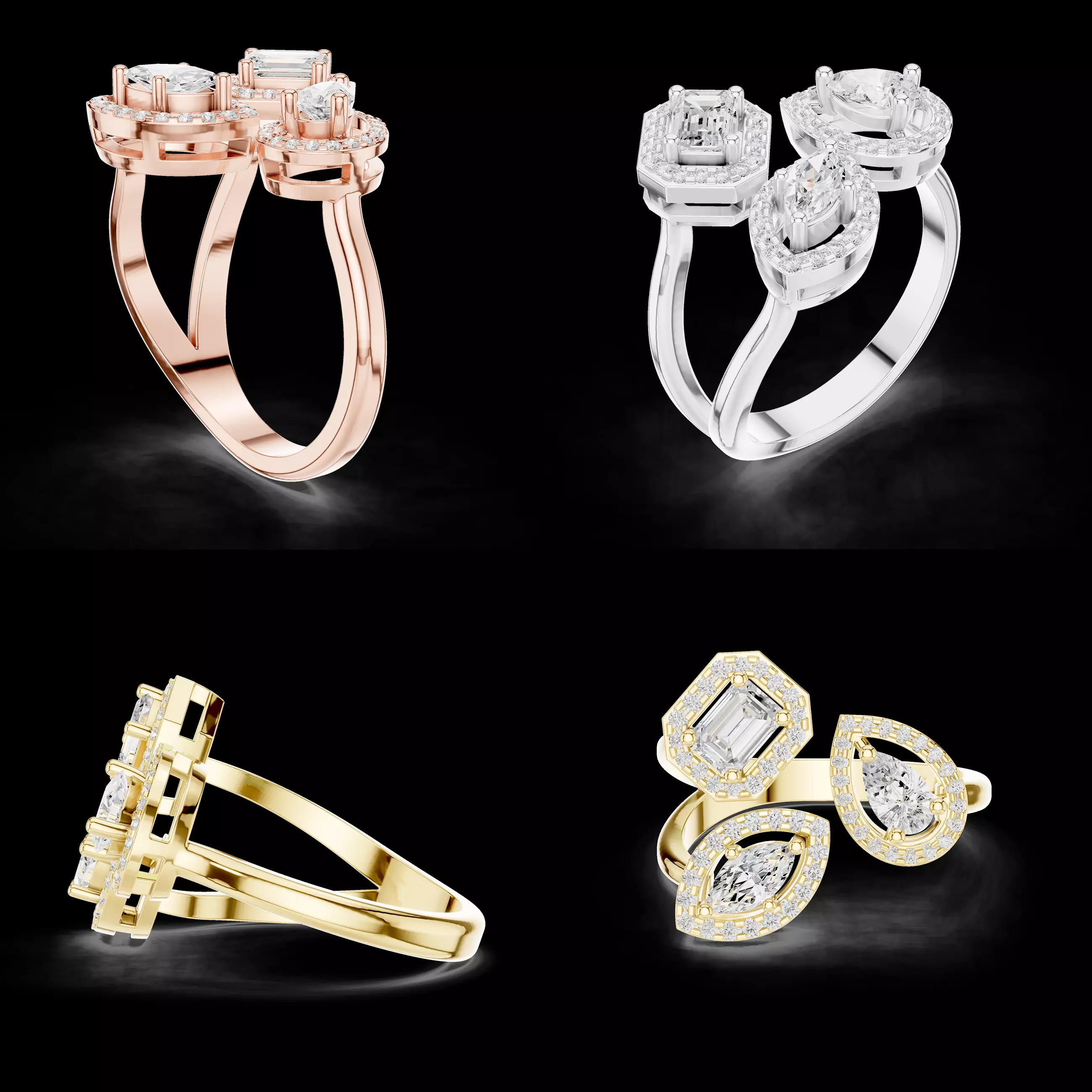 This statement Multi Stone Halo Diamond Ring CAD Design features a luxurious cluster composition with mixed-shape diamonds, including emerald, pear, and round cuts, each framed by a refined halo setting. The asymmetrical yet balanced layout creates a bold, contemporary look while maintaining elegance and harmony, making this design ideal for high-fashion jewellery, cocktail rings, and premium bridal collections.