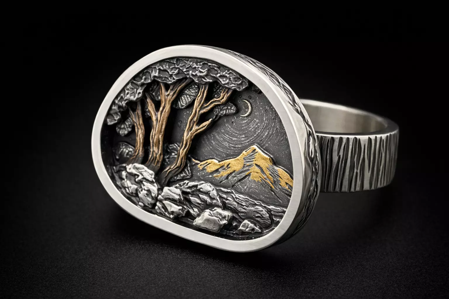 Bring the beauty of the great outdoors to your jewelry bench with this Scenic Nature Landscape Signet Ring. This masterfully crafted 3D model features a high-relief wilderness scene, including majestic mountains, a textured pine forest, and a crescent moon against a swirling night sky. The ring shank itself is adorned with a rugged, bark-like texture, making it a cohesive piece of wearable art.