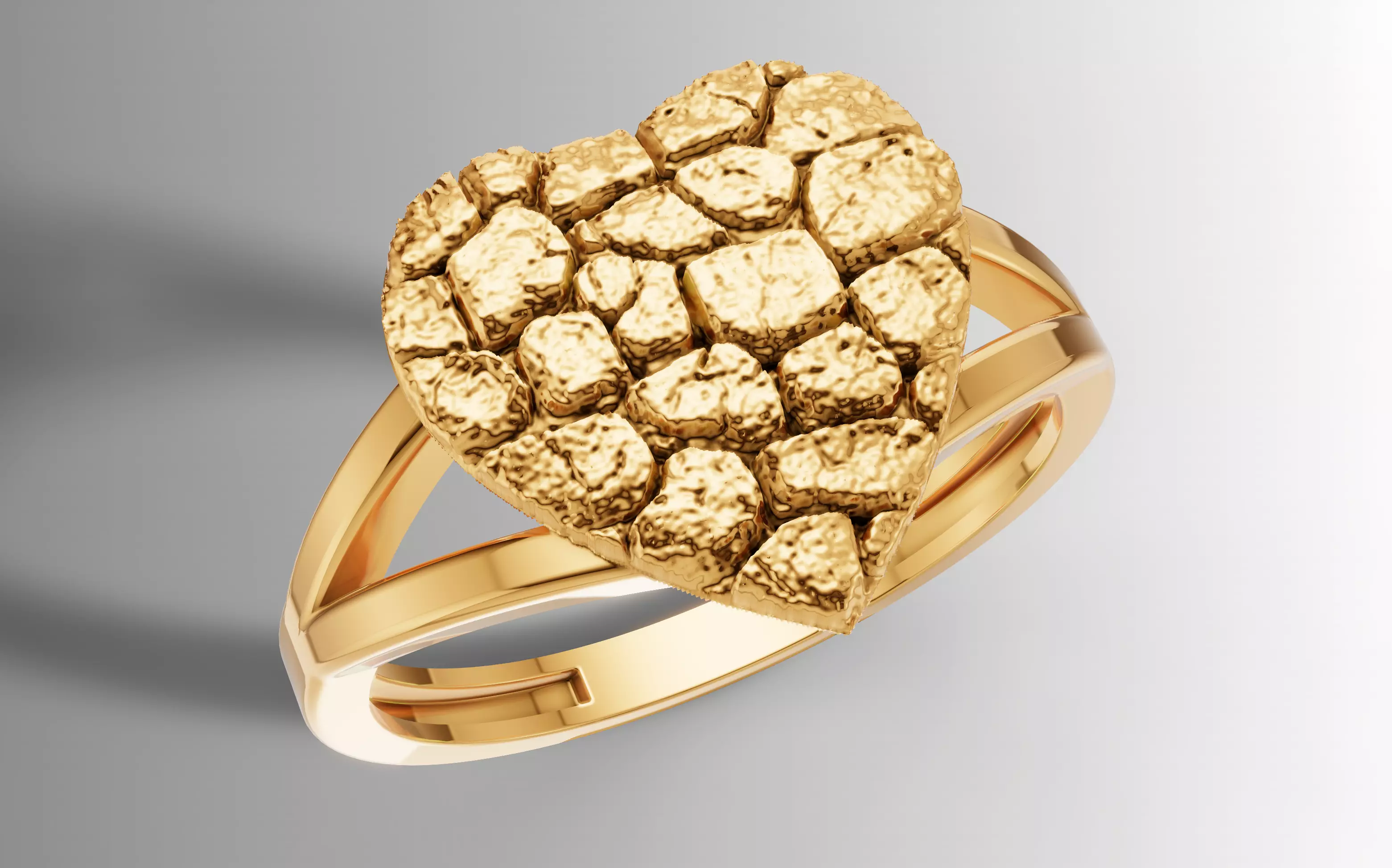 Ready-to-print 3D CAD model for a simple and modern ring design featuring a large, raised heart-shaped top with a unique cobblestone texture. The ring is a US size 8 and uses a clean split-shank band. This model contains no stones and is ready for immediate 3D printing or casting. The approximate weight in 10K Yellow Gold is 2.11 grams. Files included: STL and 3DM.