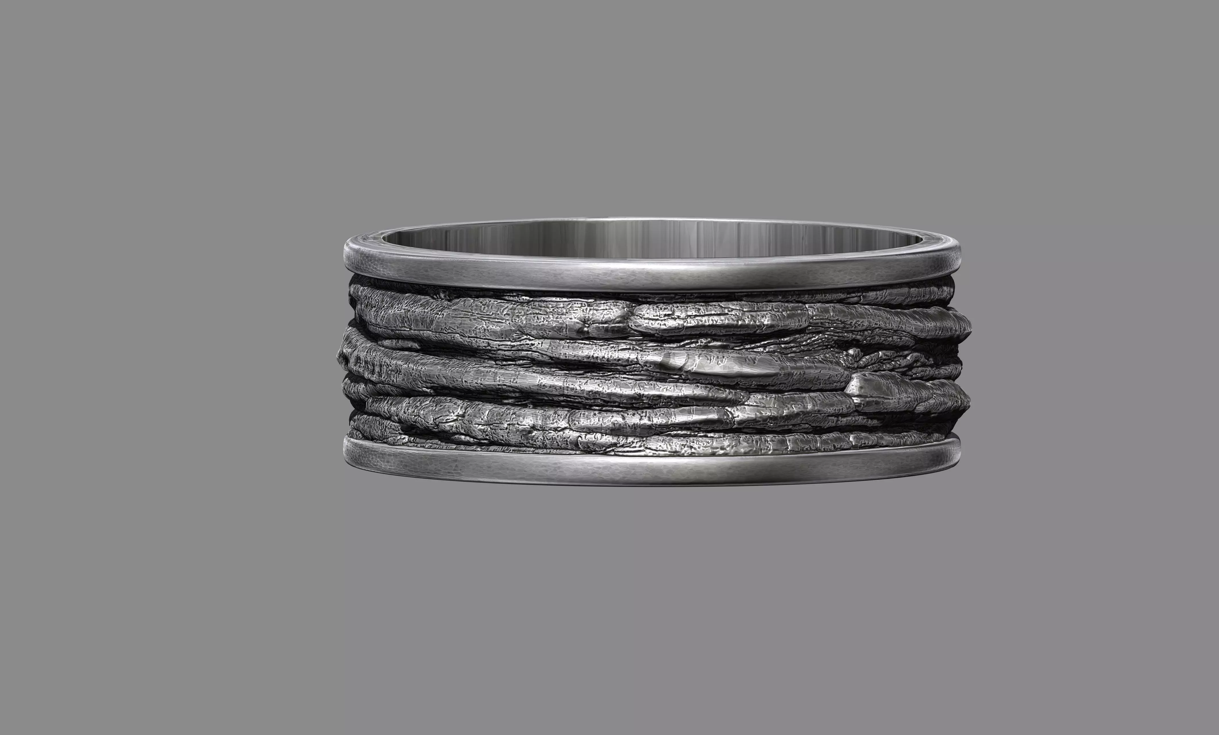 An organic, nature-inspired ring featuring a detailed tree bark texture wrapped around the band. The irregular, natural surface captures the raw beauty of woodland forms, symbolising growth, resilience, and connection to nature. Designed for high-quality 3D printing and suitable for metal casting, this ring is ideal for wedding bands, promise rings, or unique organic jewellery designs.