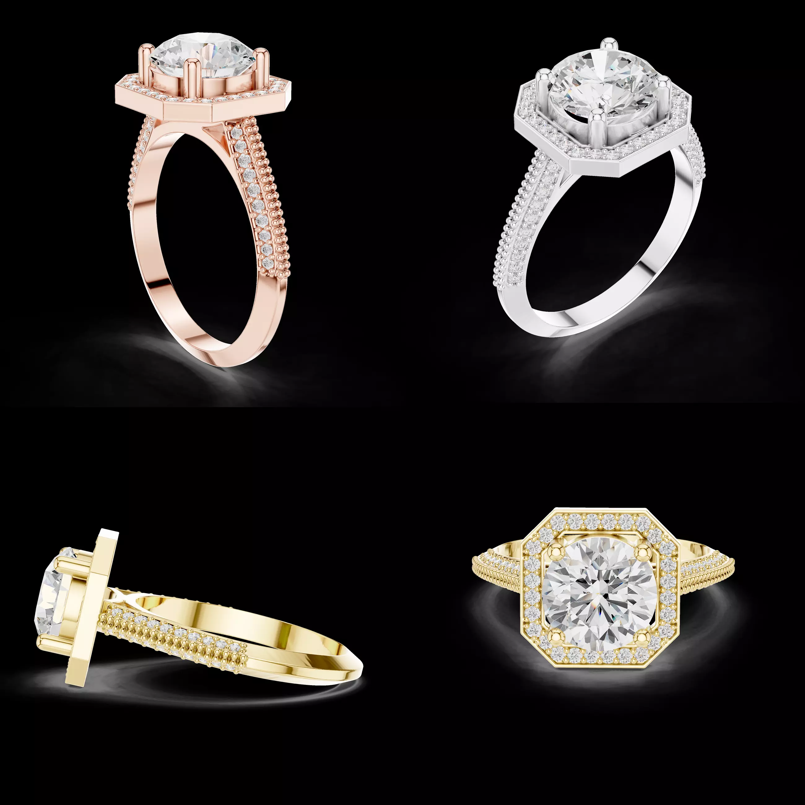 The model is professionally engineered with precise stone placement, clean topology, and strong setting geometry to ensure reliable casting and smooth stone setting in real workshop environments. The halo structure, prongs, and pavé seats are optimized for practical jewellery manufacturing rather than visual-only presentation.