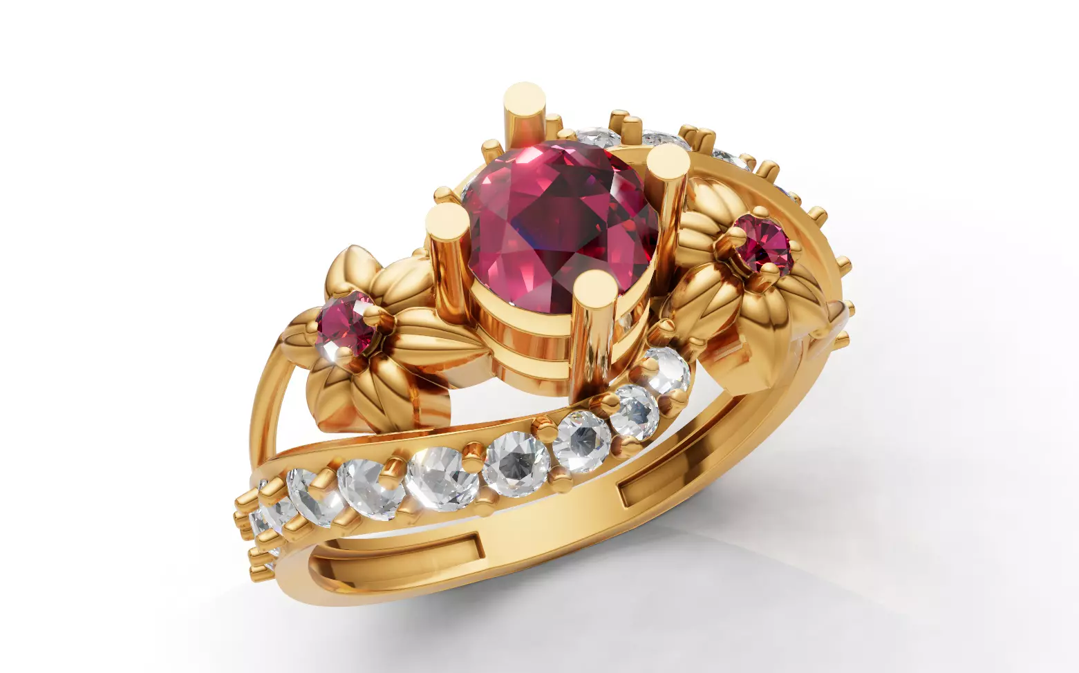 Setting Style: Organic bypass/crossover shank featuring sculpted leaves and two central flower clusters. Side stones are set in micro-prongs along the swirling metal.