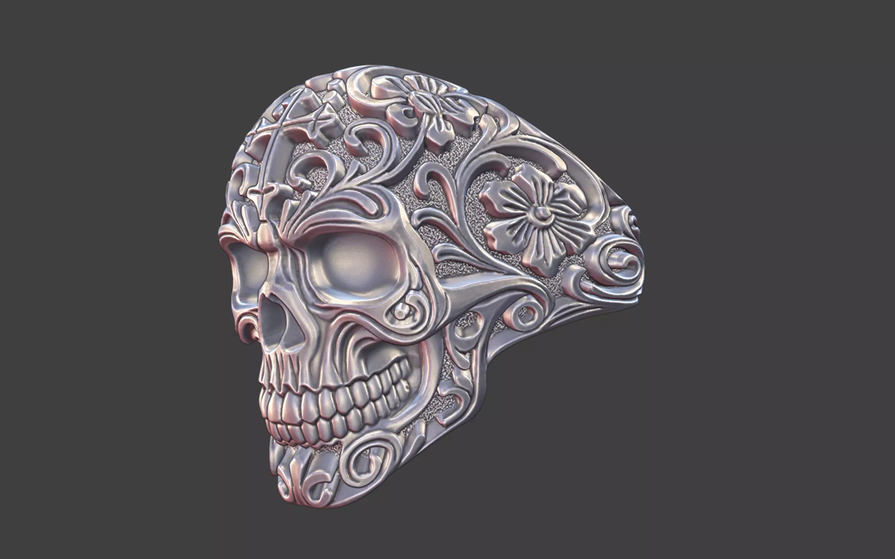 This ornate skull ring is a highly detailed piece designed for premium sterling silver jewelry production. The skull features deep scrollwork carved across the sides, creating an elegant contrast between dark oxidized recesses and polished raised surfaces. Floral motifs bloom organically , adding a refined, almost baroque sense of ornamentation. On the forehead sits a prominent engraved cross, giving the ring a symbolic, gothic presence while maintaining a balanced artistic composition.