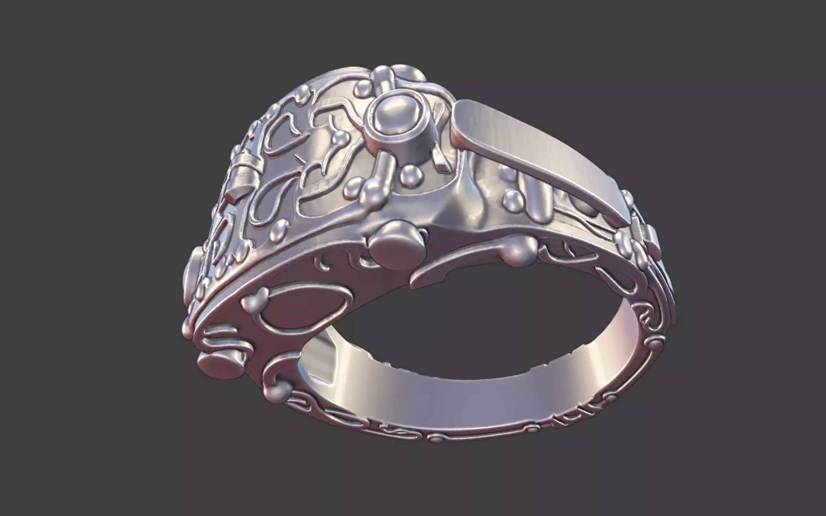 3D Model for Jewelry ProductionA striking industrial-inspired silver ring designed for bold, masculine aesthetics. The band combines mechanical elements, rivets, and layered plate textures with intricate filigree detailing for a balance of toughness and sophistication. Despite its larger volume, the ring maintains a compact height, making it comfortable to wear while projecting a powerful, engineered look. The surfaces are textured and oxidized to emphasize depth and craftsmanship, ideal for silver casting.