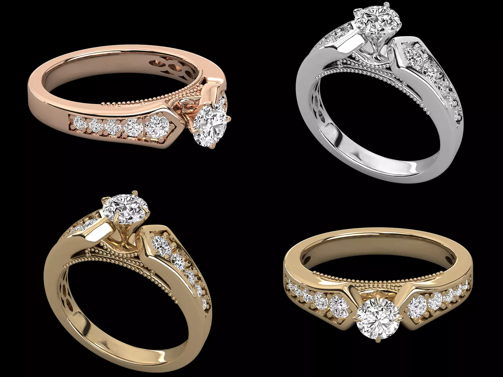 The shank showcases smooth contours with decorative elements that maintain strength and comfort while elevating the visual appeal. Every curve, stone seat, and prong is carefully optimized to ensure smooth casting, secure stone setting, and high-quality polishing results in real jewellery production.