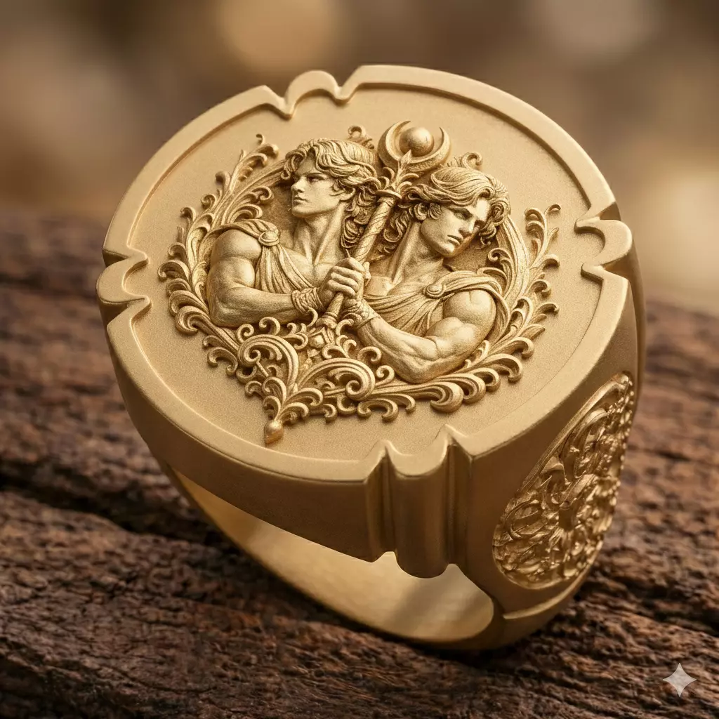 The design integrates the Gemini relief into a balanced signet ring structure, offering clean geometry and controlled depth suitable for jewelry manufacturing and symbolic ring collections.