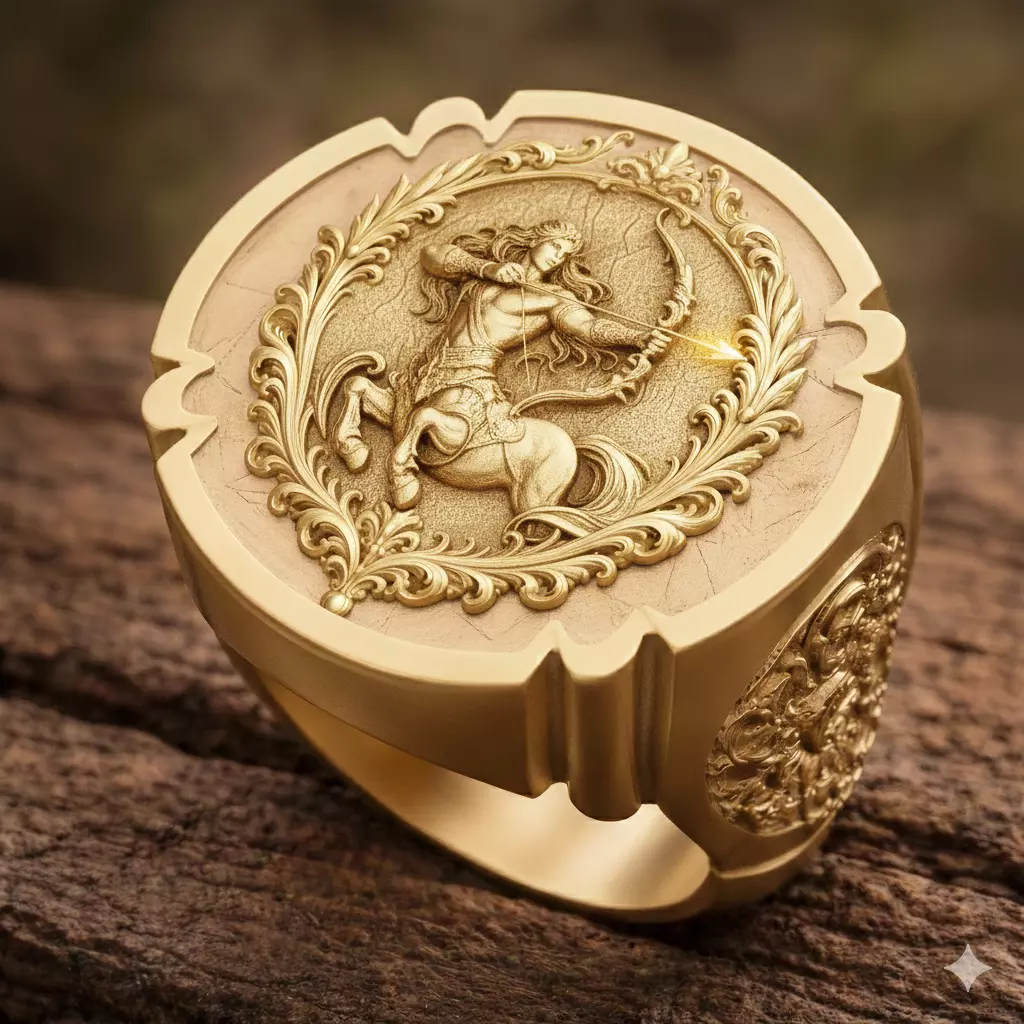 The design integrates the Sagittarius relief into a balanced signet ring form suitable for professional jewelry manufacturing.