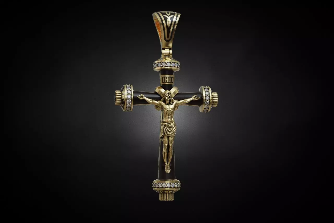 DescriptionHigh-quality 3D model of an Orthodox Crucifix Pendant featuring the Cyrillic inscription Spasi i Sohrani (Save and Protect) on the reverse side. The design is engineered for composite manufacturing, featuring specific channels for black enamel or cut onyx inserts. The decorative terminals and the bail are pave-set with gemstones.