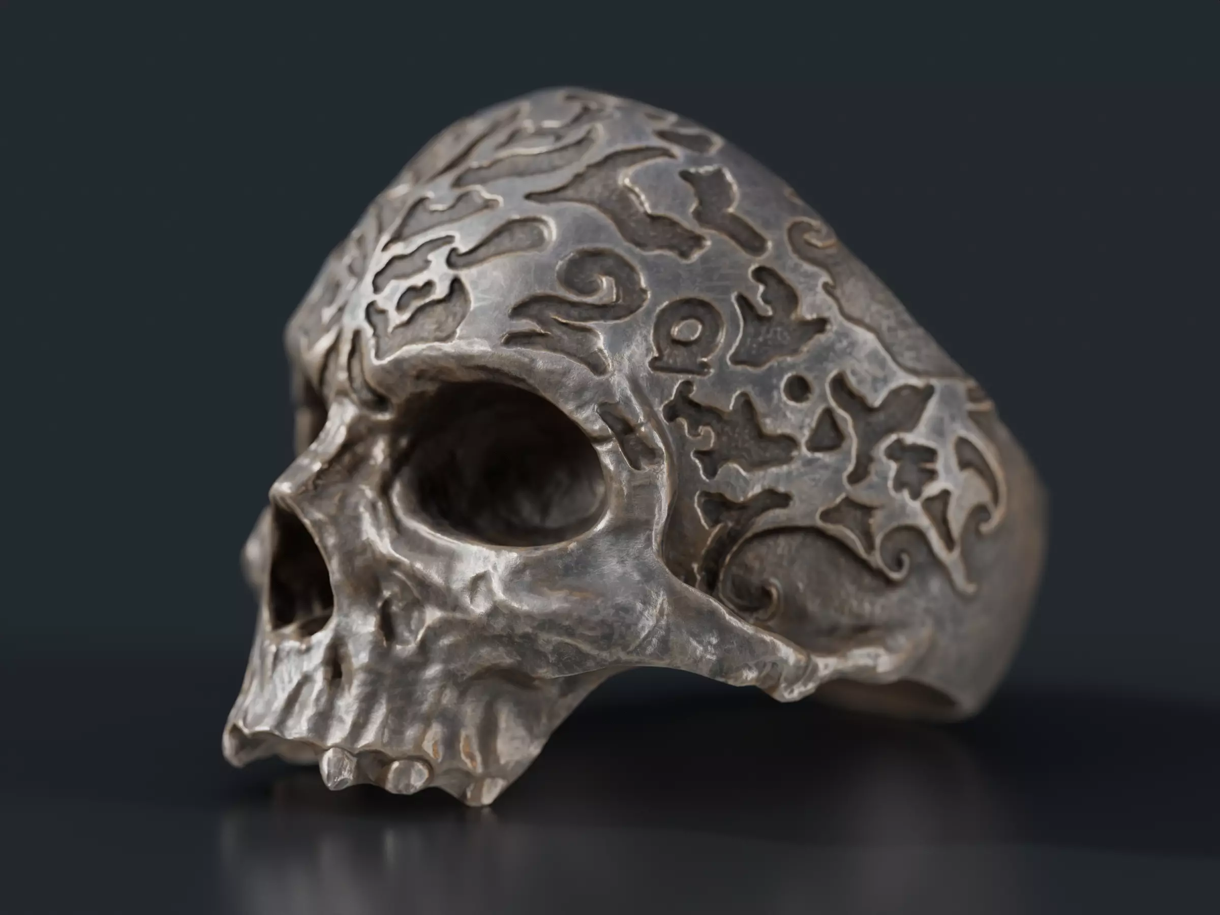 A half human skull ring with beautiful patterns on the forehead. The inner diameter of the ring is 20 mm. You can scale the whole model by percentage to make it fit your finger. Remember to measure your finger's joint not the soft part. I've cast the same model in brass, and aluminium.