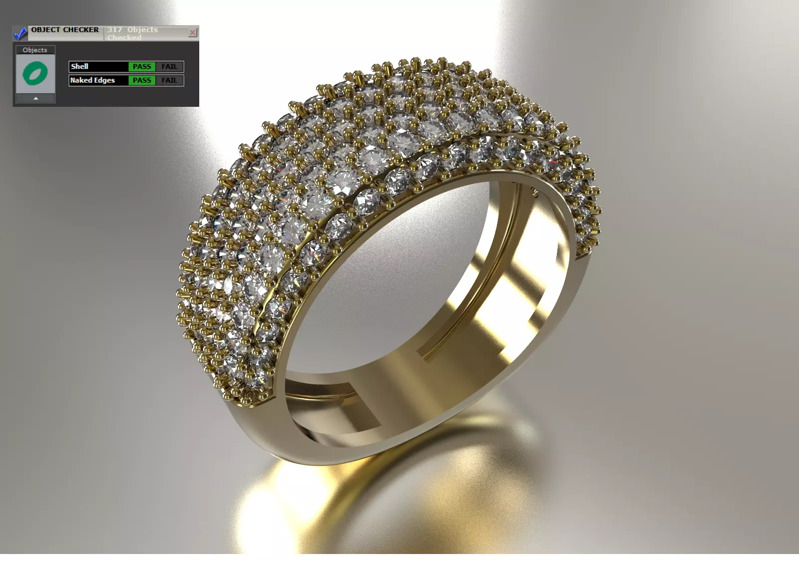 Rows: The top of the ring is made up of three dense, horizontal rows of diamonds.