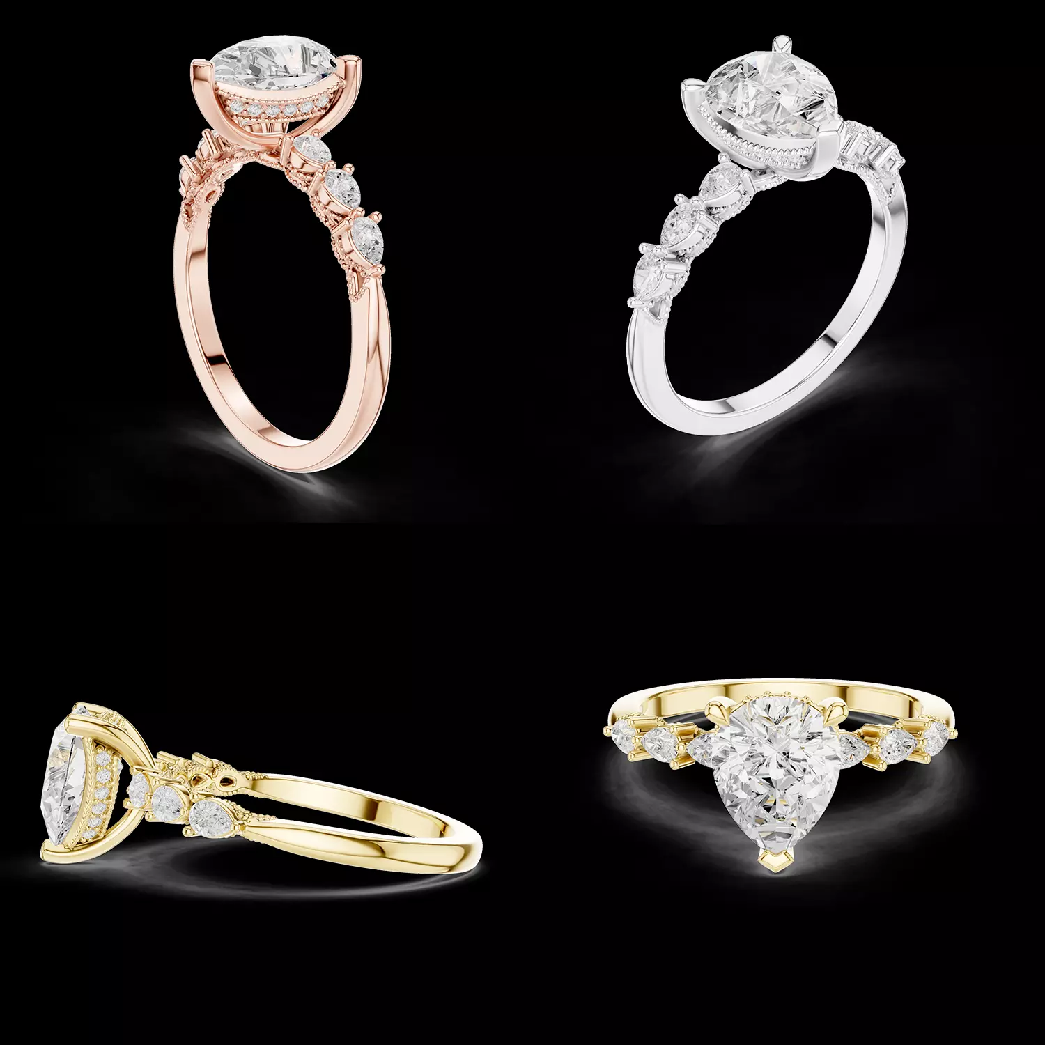 Important Points• Pear cut center stone setting• Hidden halo beneath center stone• Marquise and round side stone accents• Clean, production-ready geometry• Suitable for casting and stone setting• Easy customization options• Ideal for rendering and catalogue presentation• Compatible with jewellery CAD workflows