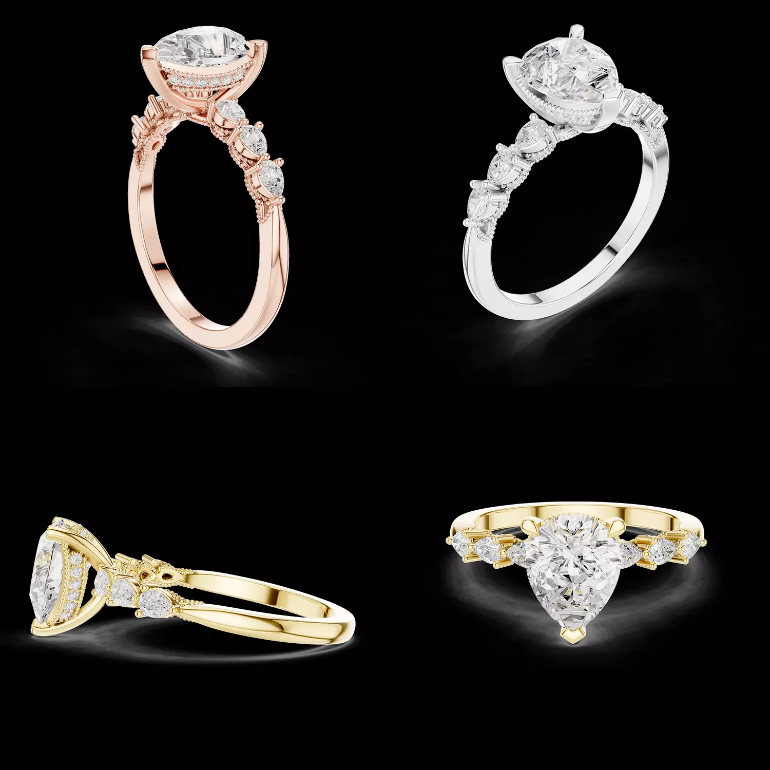 Presenting an elegant Pear Shape Diamond Engagement Ring featuring a hidden halo, marquise accent stones, and refined vintage-inspired detailing. This design beautifully combines romantic curves with intricate craftsmanship, making it ideal for luxury bridal and fine jewellery collections.