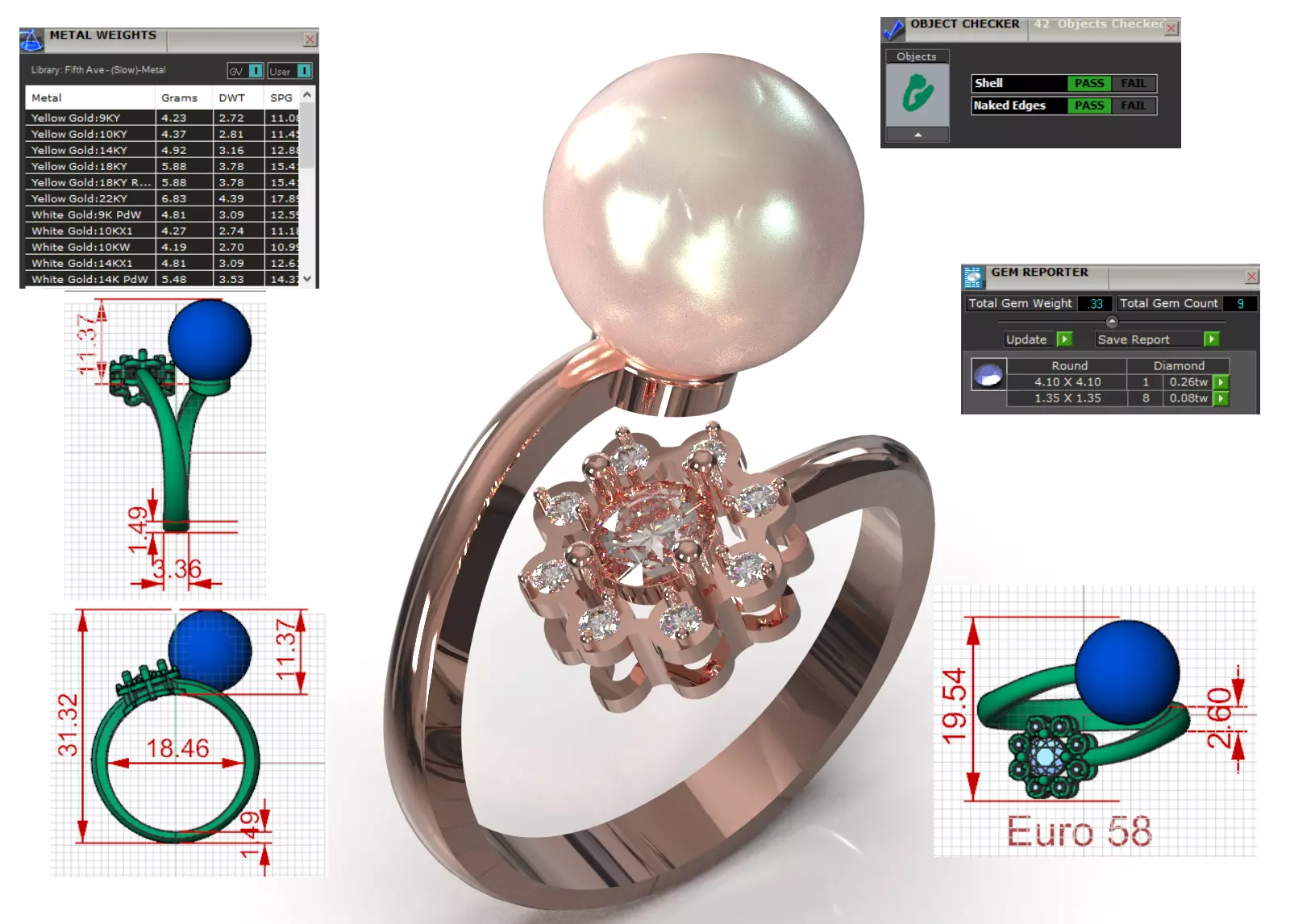 - 1. Spherical Pearl: At the top of the ring, there is a Large Round Pearl in a Pinkish/Cream color that rises from one end of the ring. This pearl adds an organic and soft element to the design.