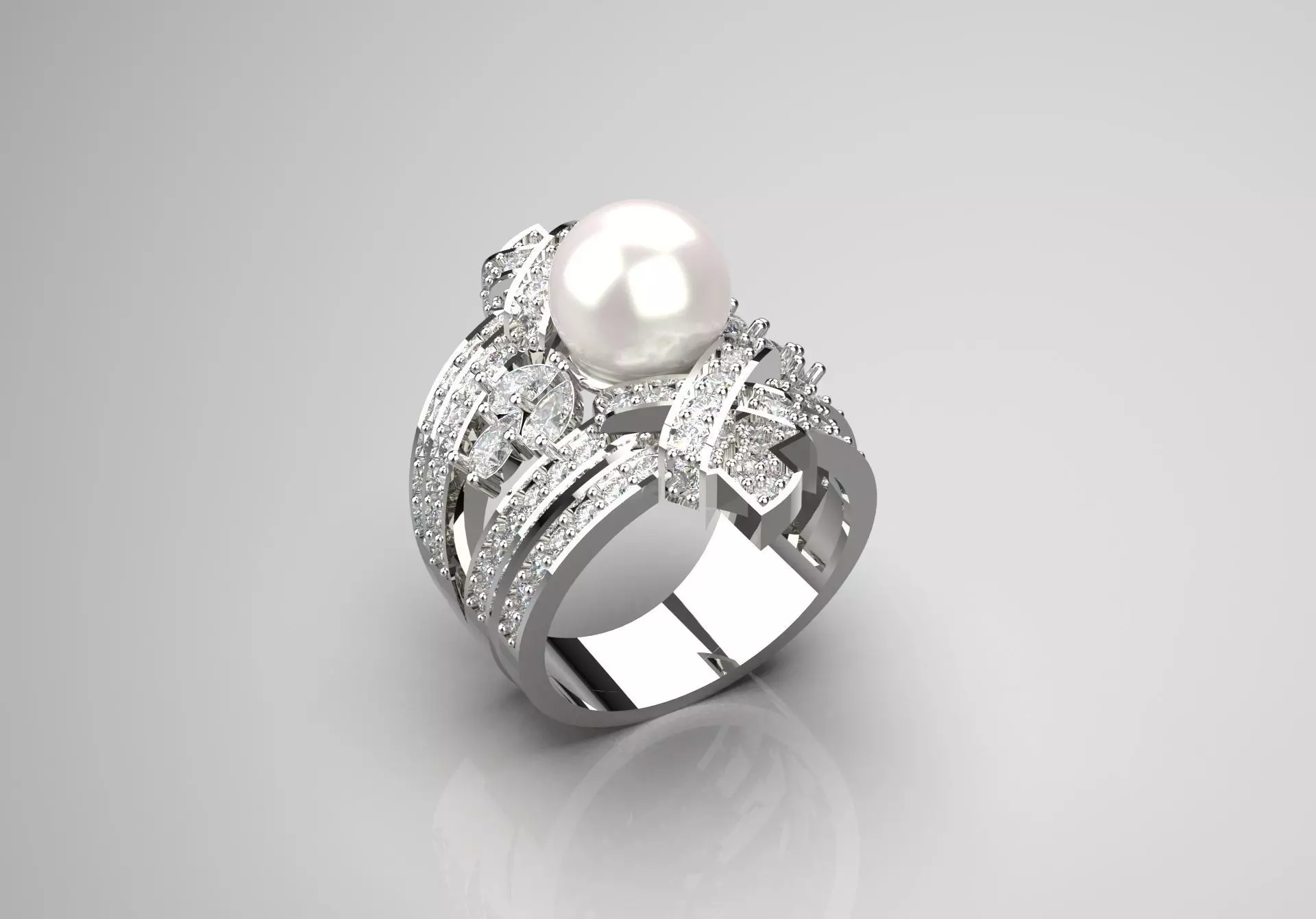 Diamonds: Surrounding the pearl and along the bands, there are several smaller diamonds including marquise and round cuts that enhance the ring’s brilliance and sparkle.
