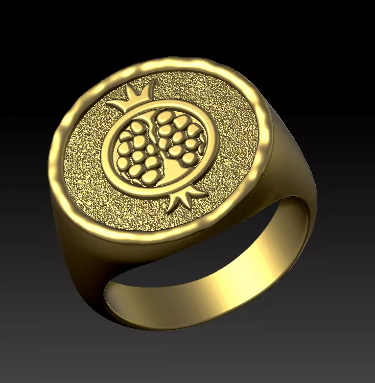 The circular top showcases a raised pomegranate motif with clustered seeds, framed by a textured background and a clean rounded border. The proportions are well-balanced, with a solid tapered shank that ensures comfort, durability, and a strong presence on the hand.