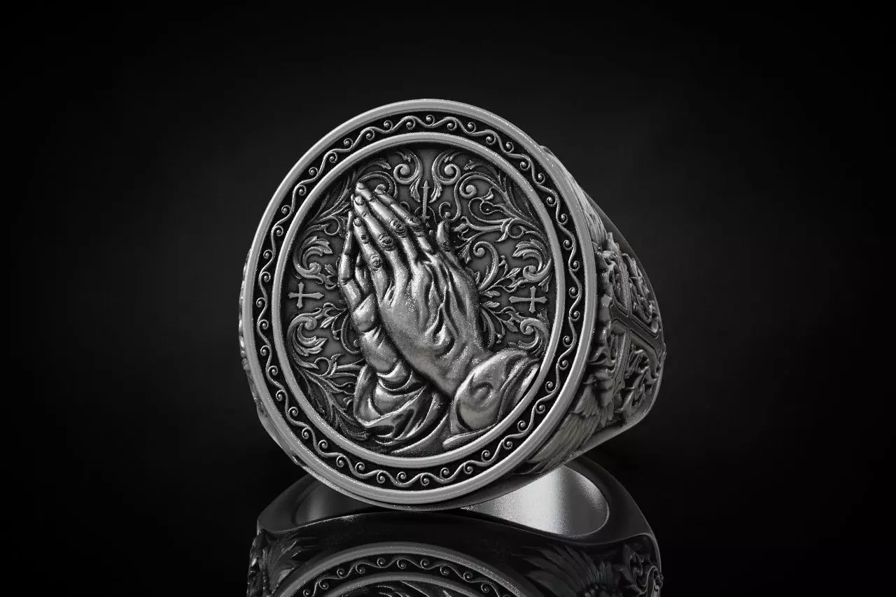 Description:Detailed signet ring featuring praying hands on the face, surrounded by ornate scrollwork, crosses, and side engravings with symbolic motifs.