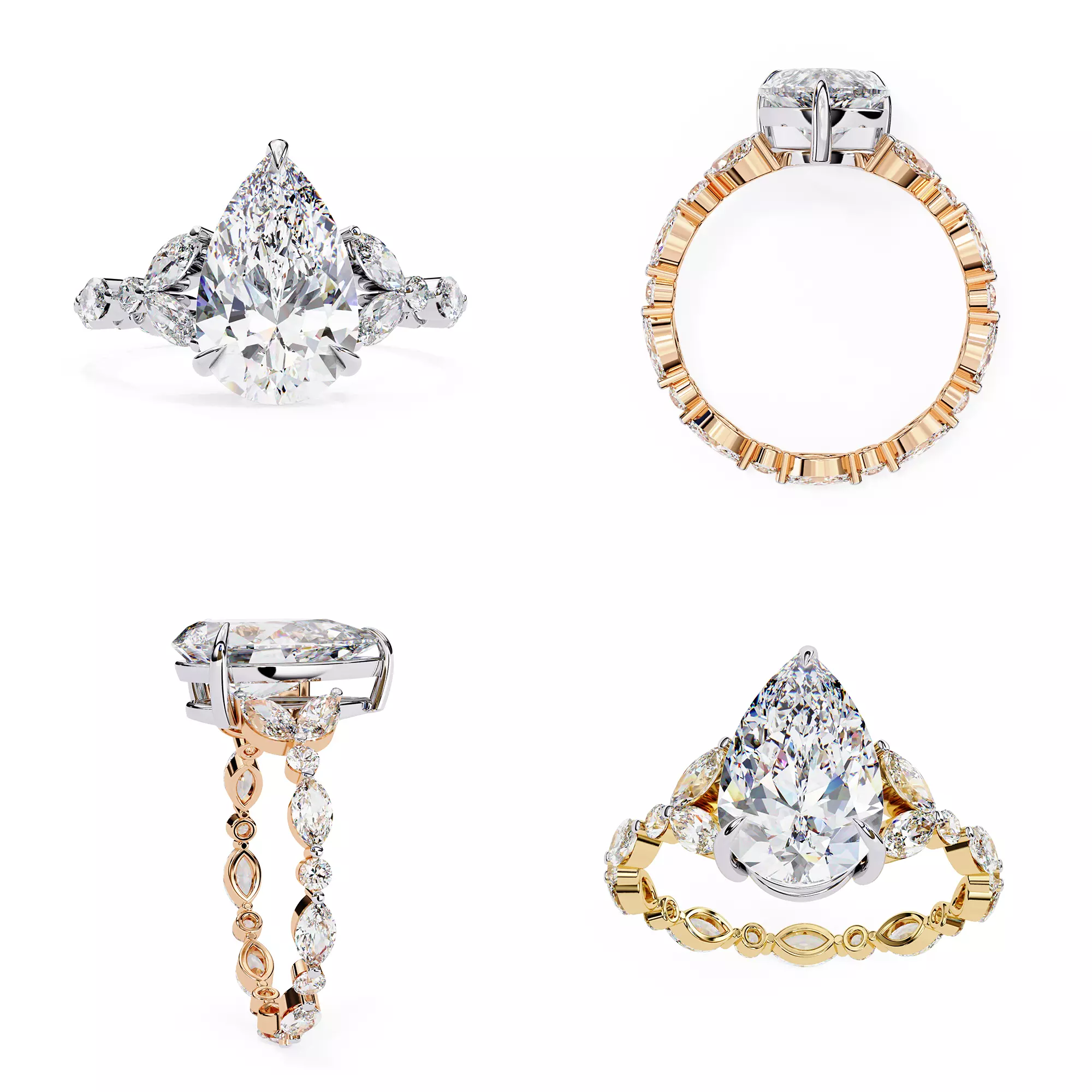 This premium jewellery CAD ring features a pear-cut center diamond set in an elegant wrap-style band that curves beautifully around the stone.One side of the shank rises to frame the gem, while the other flows underneath, giving the ring a dynamic, artistic motion effect.The band is fully decorated with micro-pavé diamonds, enhancing the sparkle and luxury.