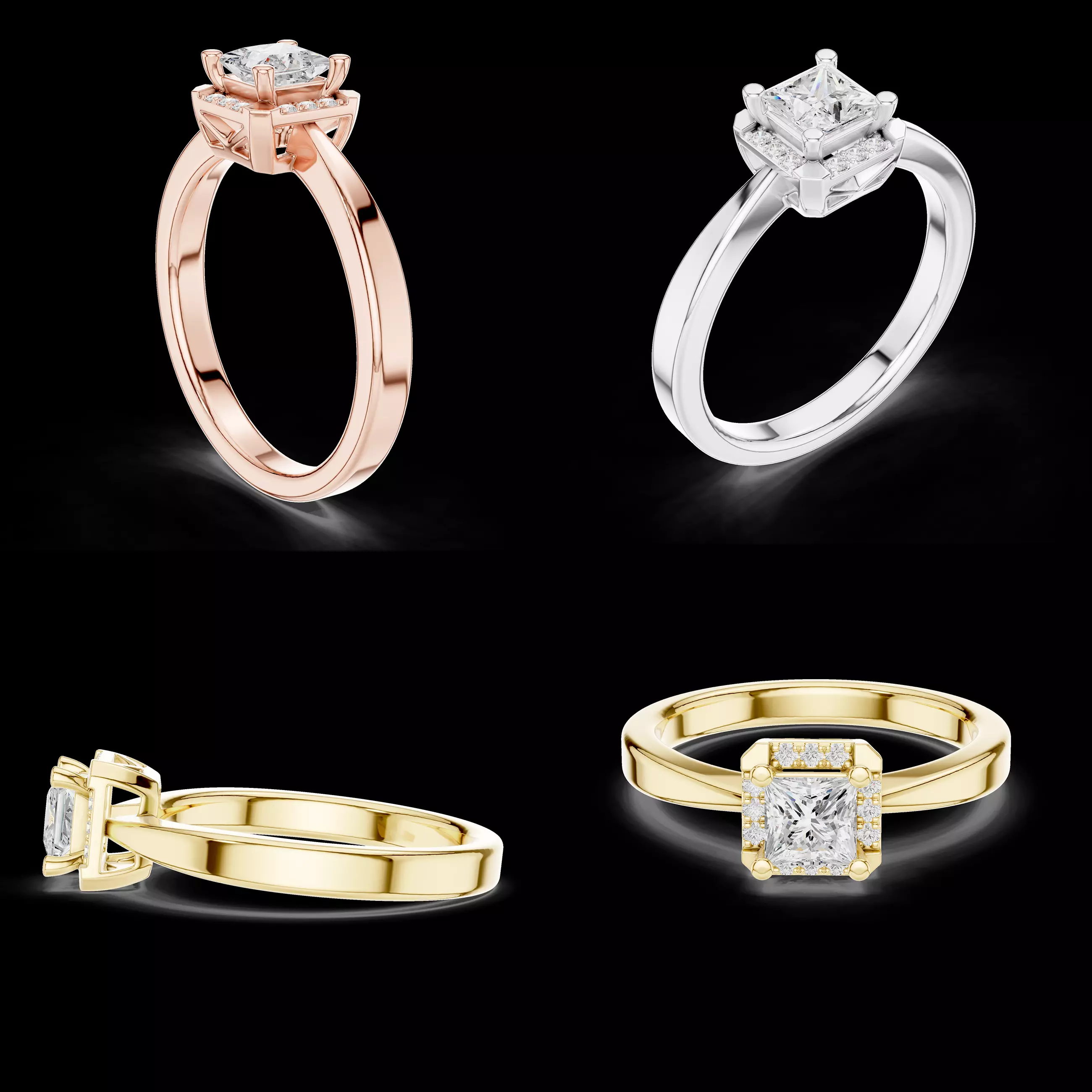 This refined halo engagement ring CAD model features a princess-cut center diamond framed by a square halo of smaller diamonds, creating enhanced brilliance and visual impact. The clean and elegant band structure complements the halo setting, resulting in a timeless yet contemporary design suited for engagement and bridal jewellery collections.