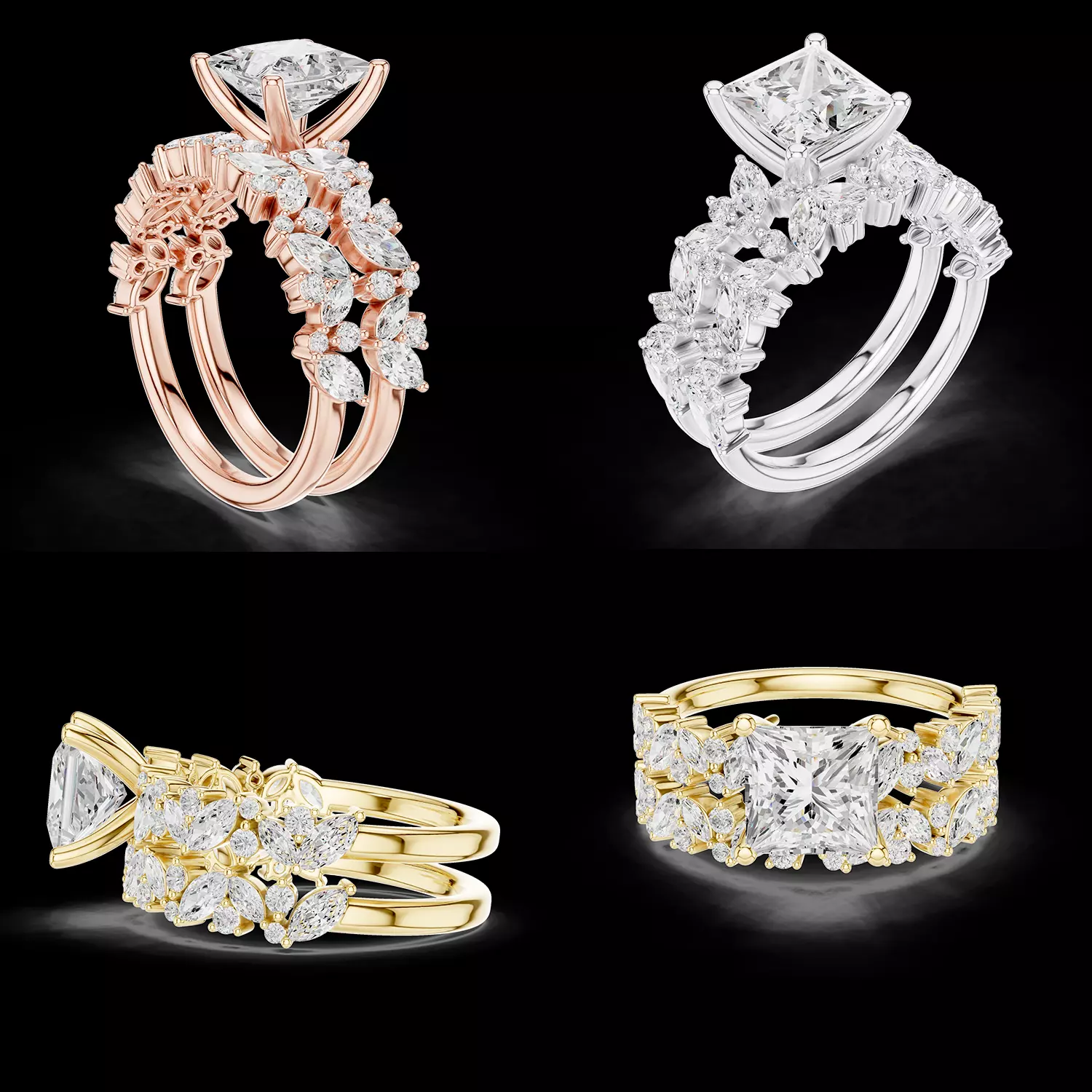 This elegant princess-cut diamond engagement ring 3D model showcases a bold double band structure combined with a refined floral-inspired cluster setting. The centerpiece features a square princess-cut stone secured with balanced prongs, designed to maximize brilliance and symmetry.