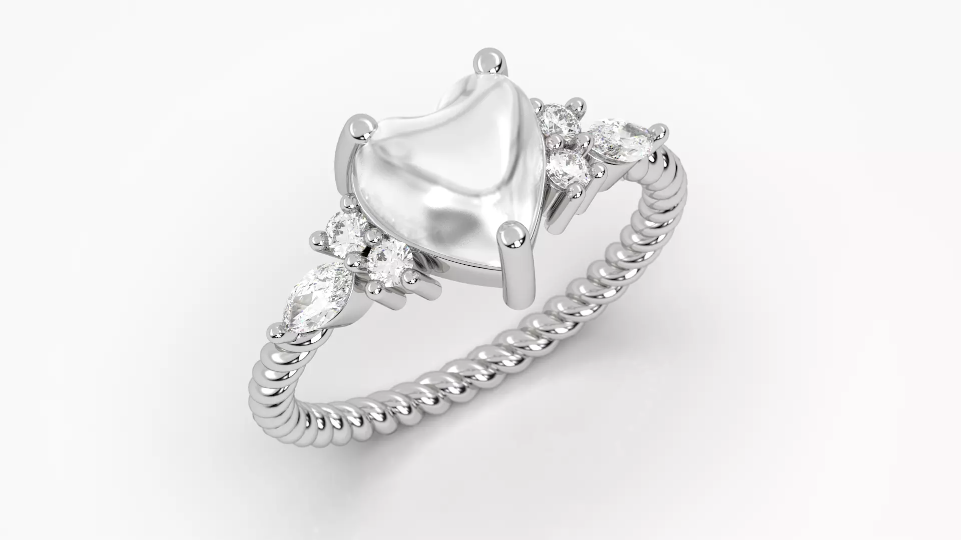 This 3D model features a romantic puffy heart center stone set in a refined four-prong setting, complemented by sparkling marquise and round side stones arranged in a floral cluster design. The twisted rope band adds a modern, elegant texture that enhances the overall visual appeal.