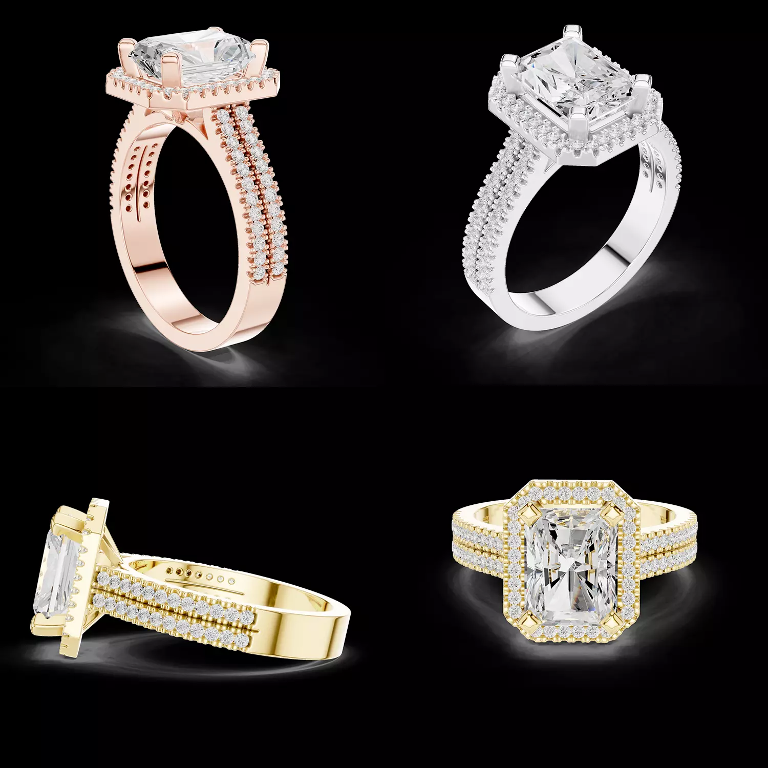 Important PointsProfessional jewellery CAD model prepared for manufacturingRadiant cut center stone with double halo diamond settingMulti-row pavé diamond band for enhanced brillianceClean geometry suitable for casting and stone settingBalanced band thickness for durability and comfortHigh quality design suitable for rendering and visualizationCompatible with most jewellery CAD and CAM softwareIdeal for luxury engagement rings and bridal collections