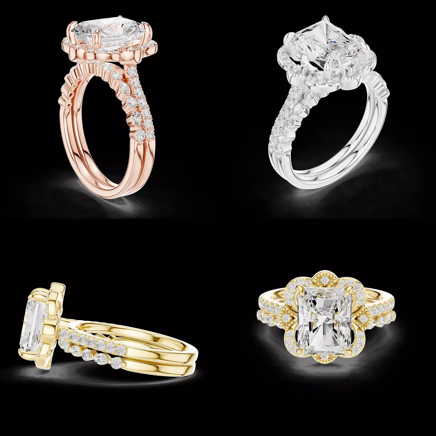 Intricate side detailing beneath the halo adds structural refinement and visual depth, smoothly connecting the head and band while enhancing craftsmanship. The prong configuration is engineered to securely hold the radiant-cut center stone while allowing maximum light entry for enhanced brilliance and fire.