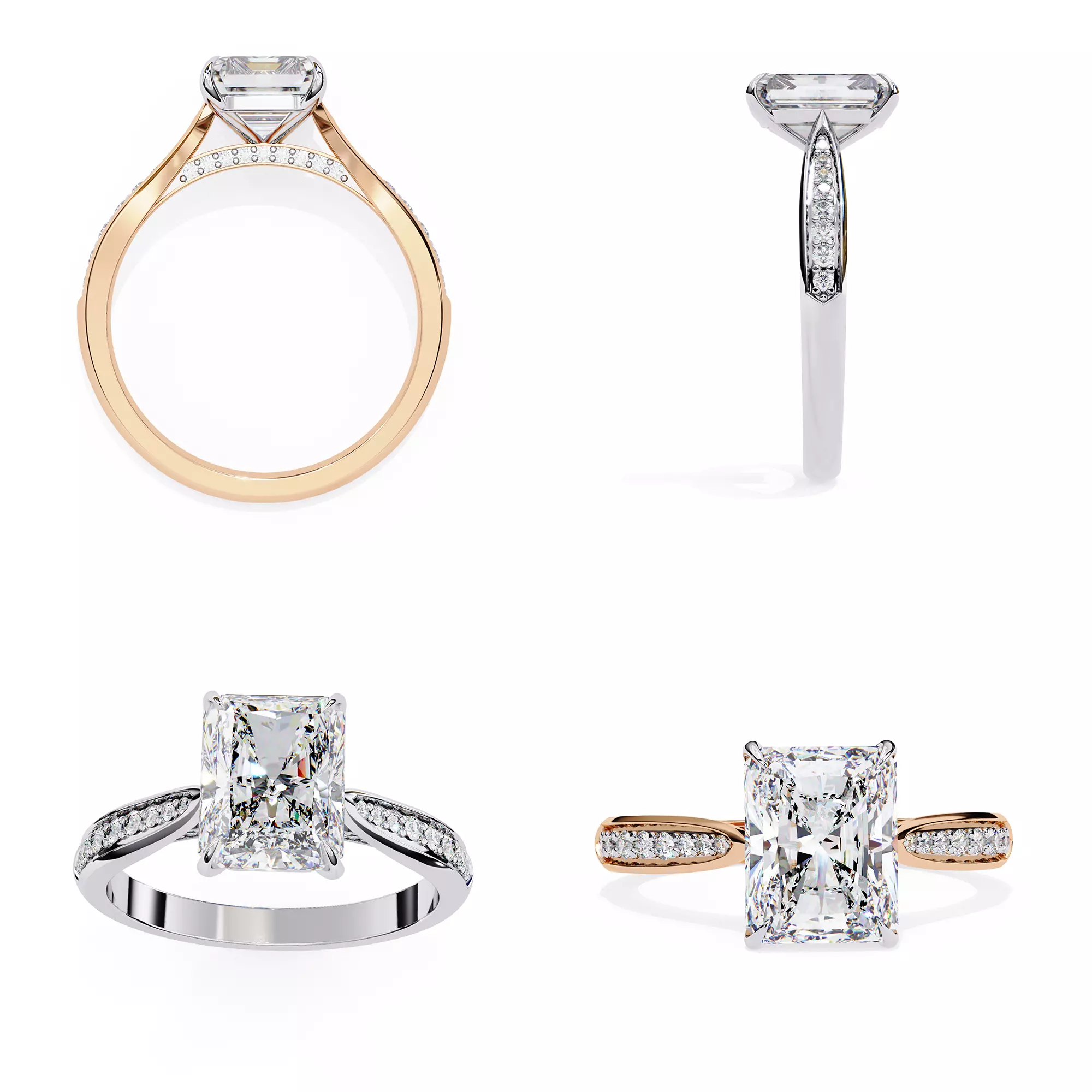 A beautifully crafted Radiant Cut Engagement Ring CAD model designed with a modern split shank and elegant micro-pavé detailing.The radiant-cut center stone gives maximum brilliance, and the flowing band design adds a luxurious aesthetic perfect for premium bridal collections.