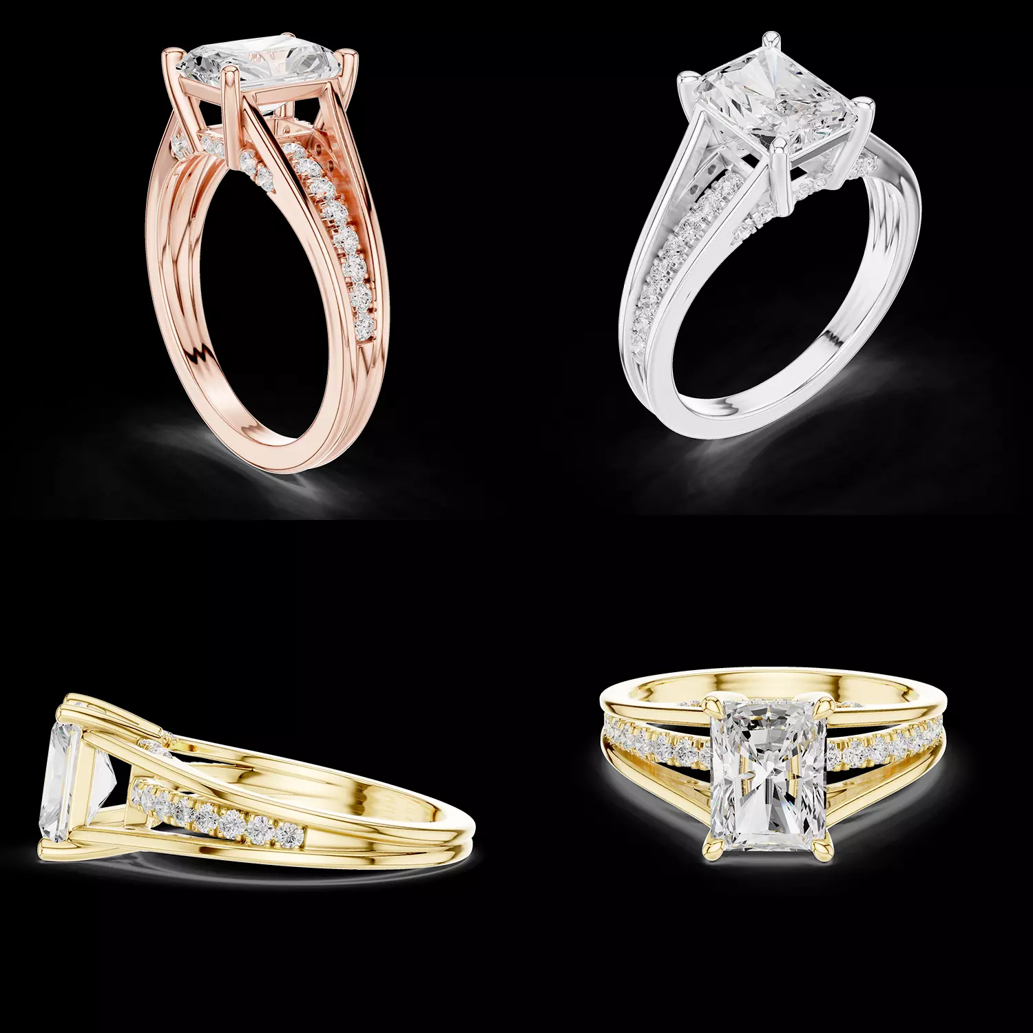 • Manufacturing-ready CAD model• Radiant cut center stone setting• Four-prong secure structure• Split shank band design• Inner pave diamond channel• Optimized metal thickness• Customizable stone dimensions