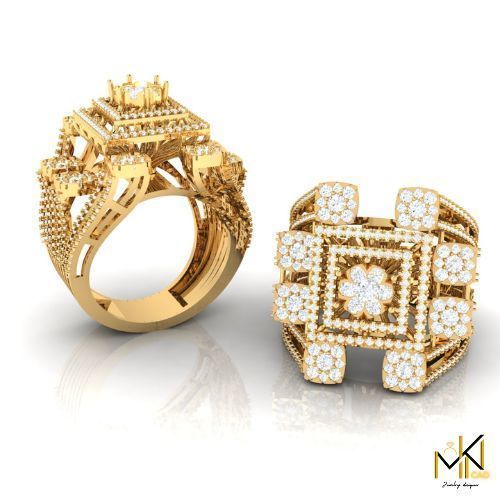 This luxurious 3D gold ring model features an intricate floral cluster design surrounded by layered diamond frames. Inspired by regal architecture and traditional craftsmanship, the ring blends opulence and symmetry, making it perfect for bridal, engagement, or festive collections. A premium CAD design suitable for professional jewelry manufacturing.