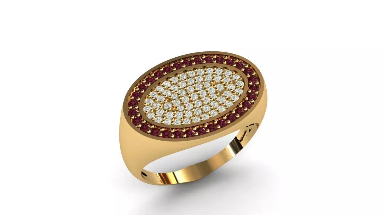 The Regal Oval Pavé Signet Ring is a luxurious jewelry design crafted for production, featuring an elegant oval-shaped face with a double halo of brilliant-cut stones. The center pavé setting showcases sparkling white diamonds, framed by an outer halo of vibrant round-cut rubies, creating a bold yet timeless look.This high-quality 3D model is optimized for 3D printing, wax carving, and fine jewelry casting, ideal for both men's and unisex collections.