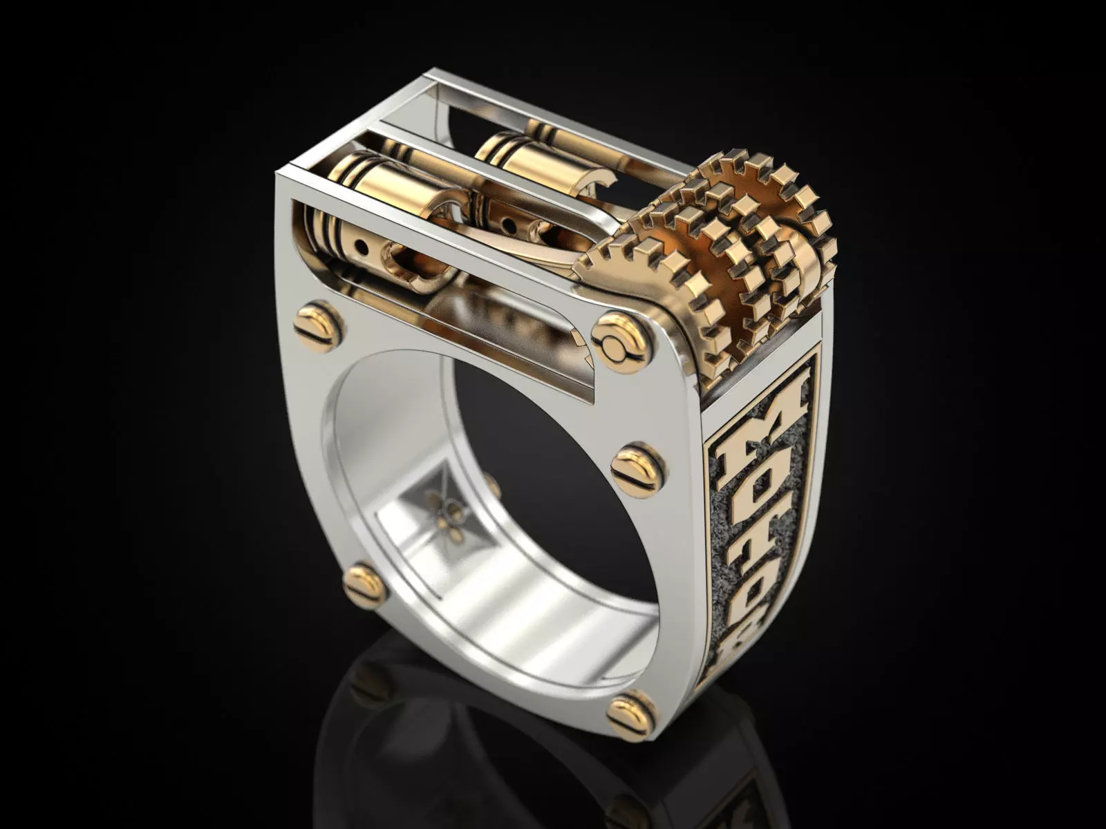 The Mechanics ring for all engine lovers a detail and unique Engine working piston ring.The piston is a moving part on the rings top cylinder, it moves by rolling the top gears back and forwards, gears can not move all around as there is not a camshaft on the gears.