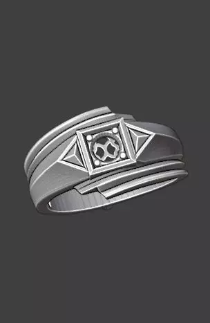 It's a 3D printed model ring with a geometric design, intended for men's jewelry.It features a central square base for a stone.The design includes triangular details on the sides.