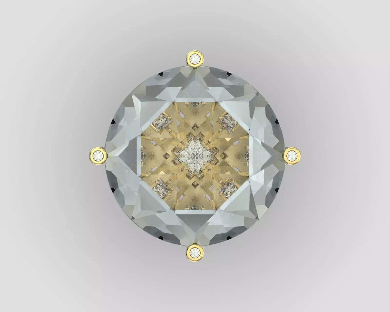 Ring with big transparent stone through which is seen ornaments around shining stones.