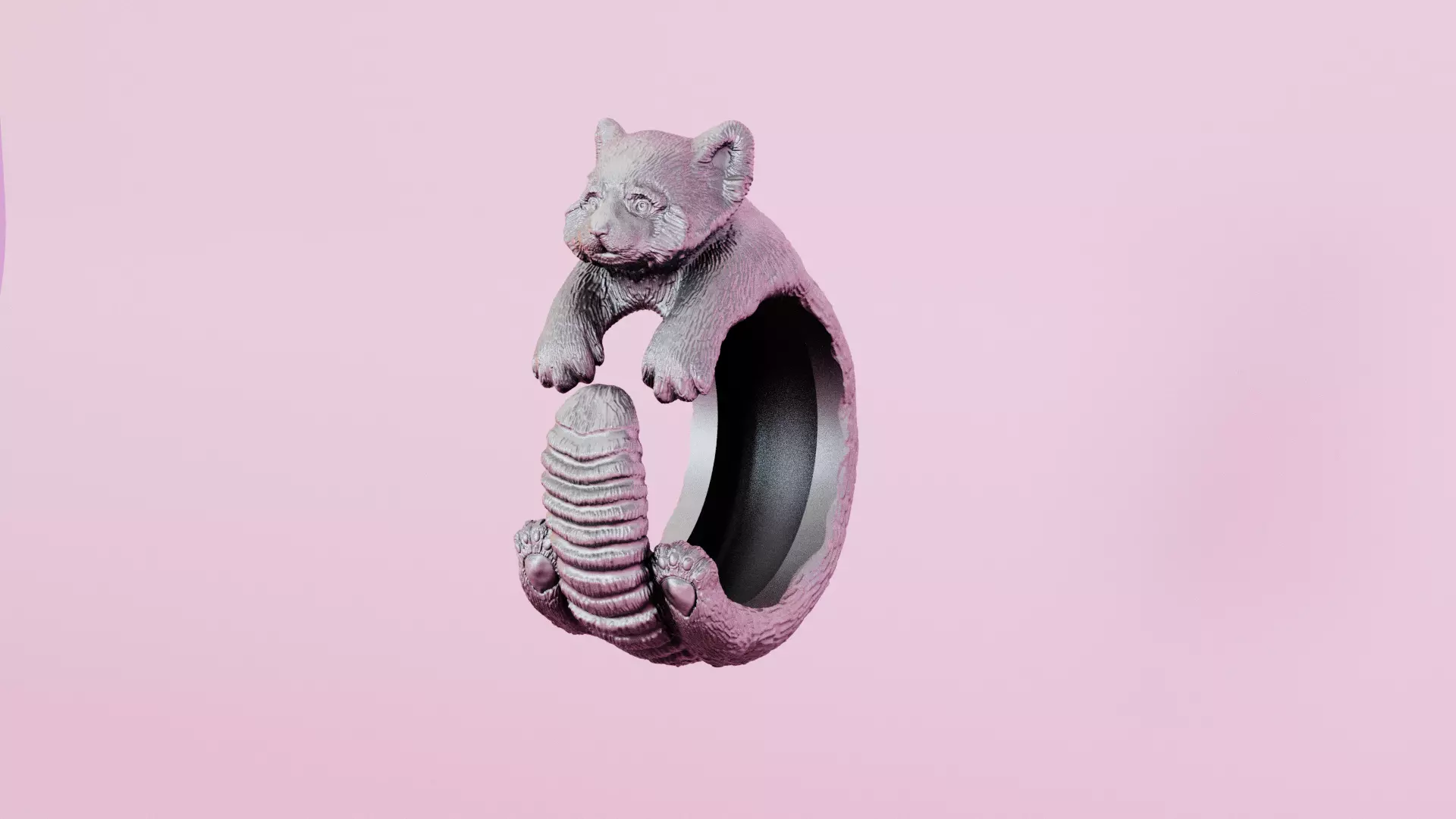 A ring in the form of a red panda will watch with interest from your finger, observing the world around you. The ring is made in the Blender 3D program.