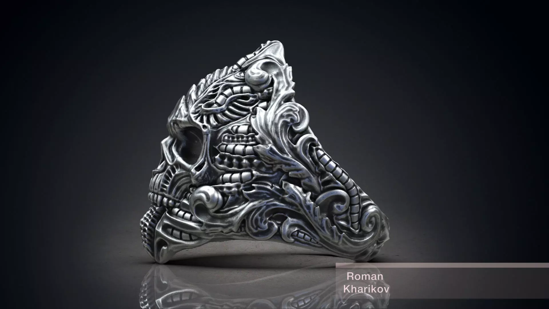 Ring Model is fully ready for 3d printing of plastic, metal or jewelry wax! Ring Skull Biomechanics style STL 3d model for 3d printing. Recommended material - oxidized silver. Ring 1: Size - 17.5mm; Volume - 1.54 cubic centimeters.