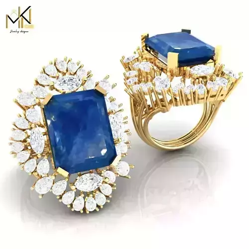 A mesmerizing ring featuring a deep blue gemstone at its heart, exuding elegance and sophistication. The captivating center stone is embraced by a halo of sparkling diamonds, enhancing its brilliance and creating a timeless, luxurious allure. Set in a finely crafted band, this ring is a perfect blend of classic beauty and modern refinement, making it an exquisite statement piece for any occasion.