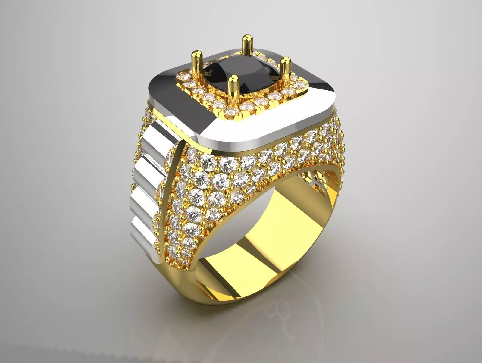The image shows a luxurious and intricate ring that features a combination of yellow gold, white gold, and multiple embedded diamonds. The ring has a bold and modern design with a square top that features a central black sapphire gemstone with four gold prongs. Surrounding the black gemstone is a border of small, clear diamonds that add to its brilliance and elegance.