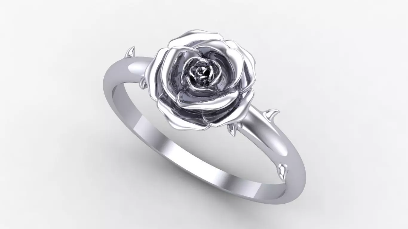 Rose Ring.3D design of a ring with an estimated weight of approximately 3.5g in 18K gold (750). The piece features a high-relief rose sculpture on the top and a thin shank with details resembling a stem. The dimensions of the piece are shown in the image in millimeters.The file is provided in STL format.The model is watertight (manifold), suitable for 3D printing, including wax printing for jewelry casting.