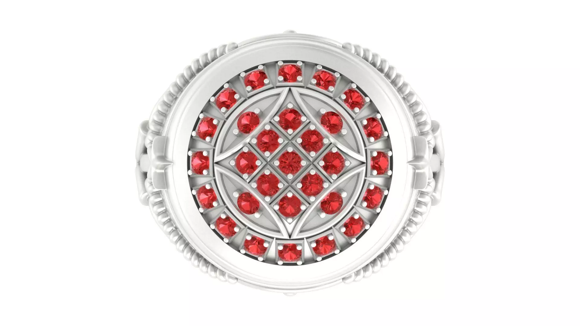 A 3D perspective of the ring reveals the placement of the gemstones and decorative elements around the design.The domed design and gemstone arrangement are clearly visible.Side Views: