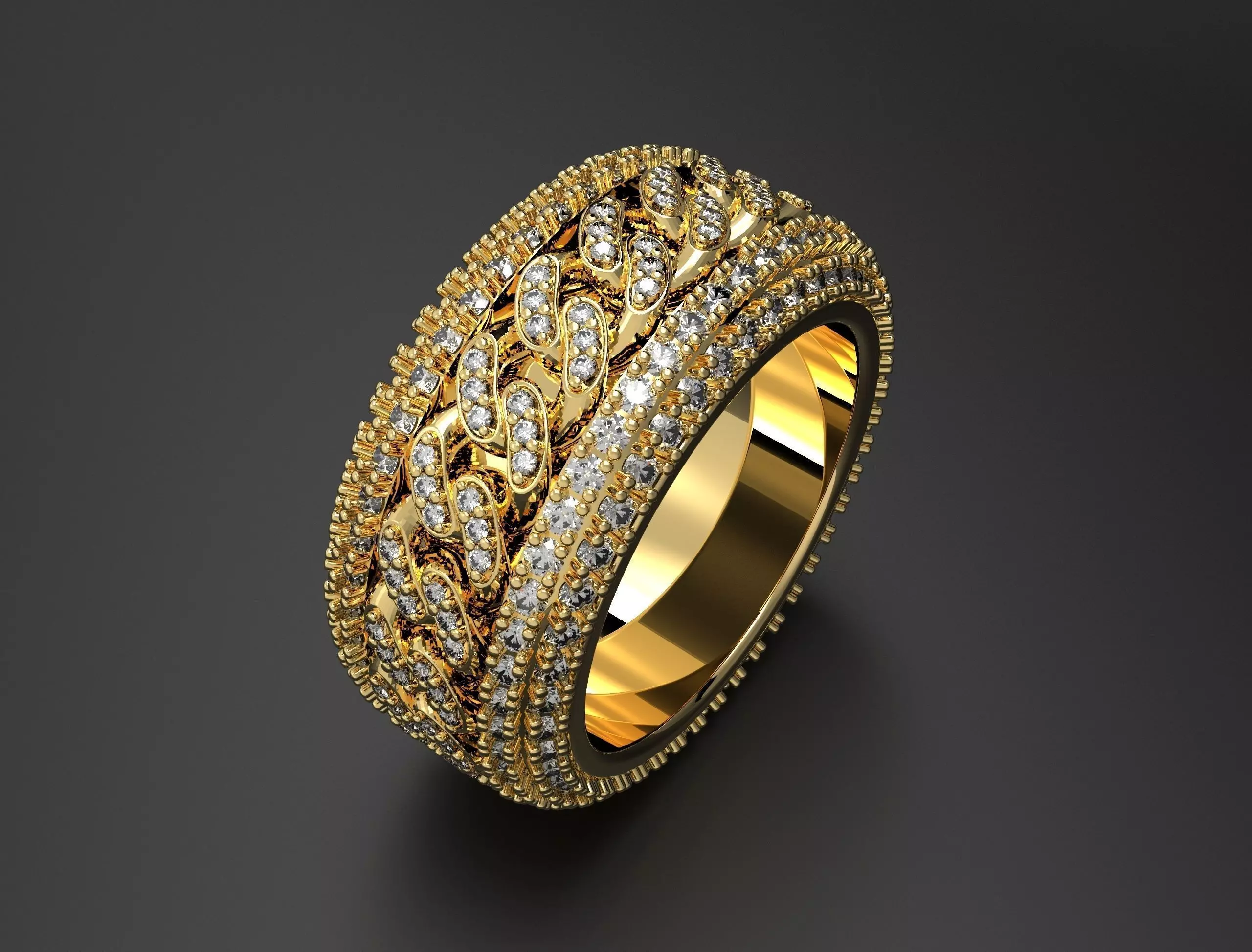 This wide-band ring features a rotating Cuban link surrounded by two pavé-covered rims. Engineered with high precision for size 8 US, this design delivers a stunning visual with motion.